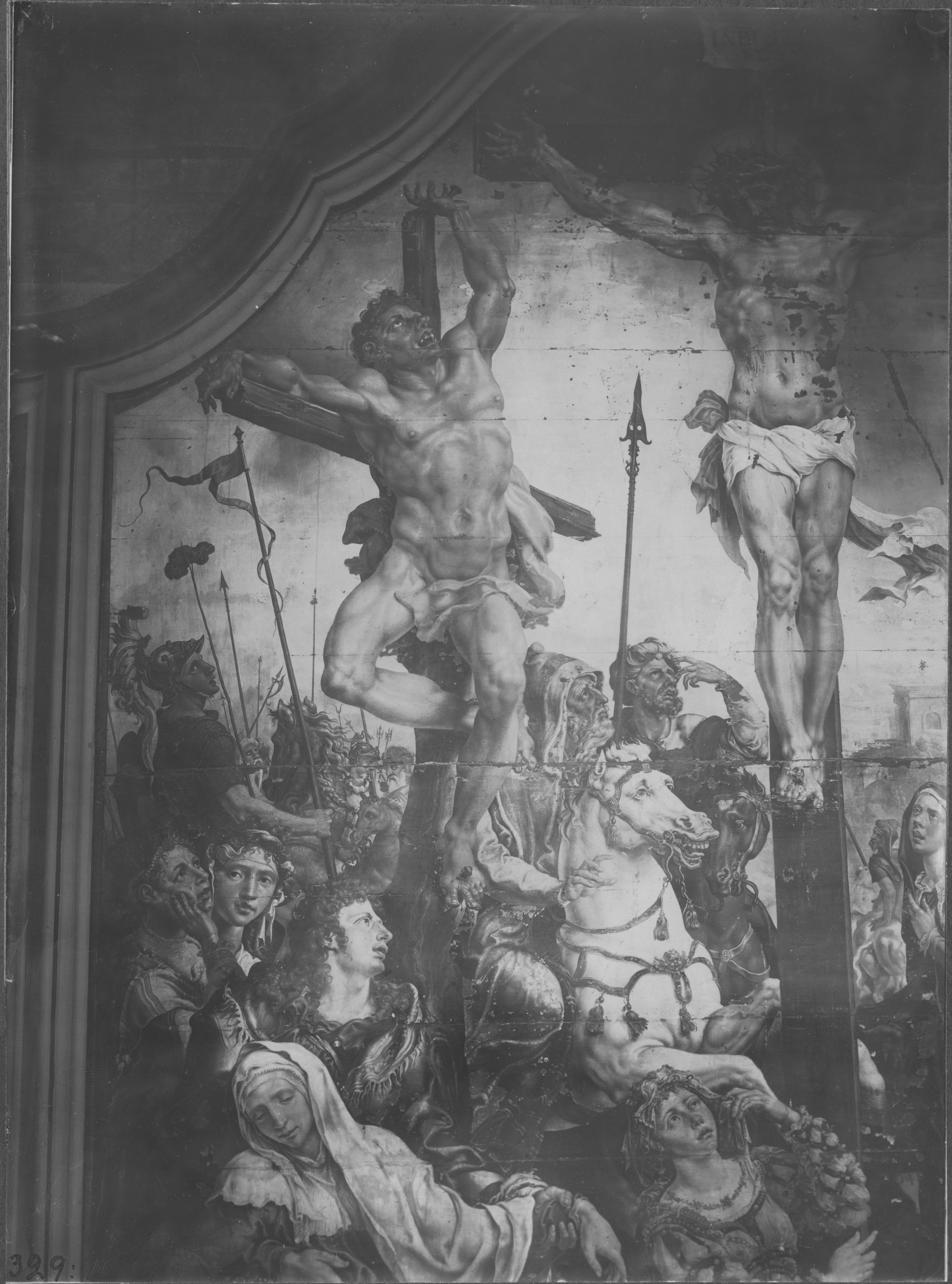 Beskrivning: Altarskåp av ek, krederat och målat, detalj. Av Maerten van Heemskerck 1538-1543. Före konservering.