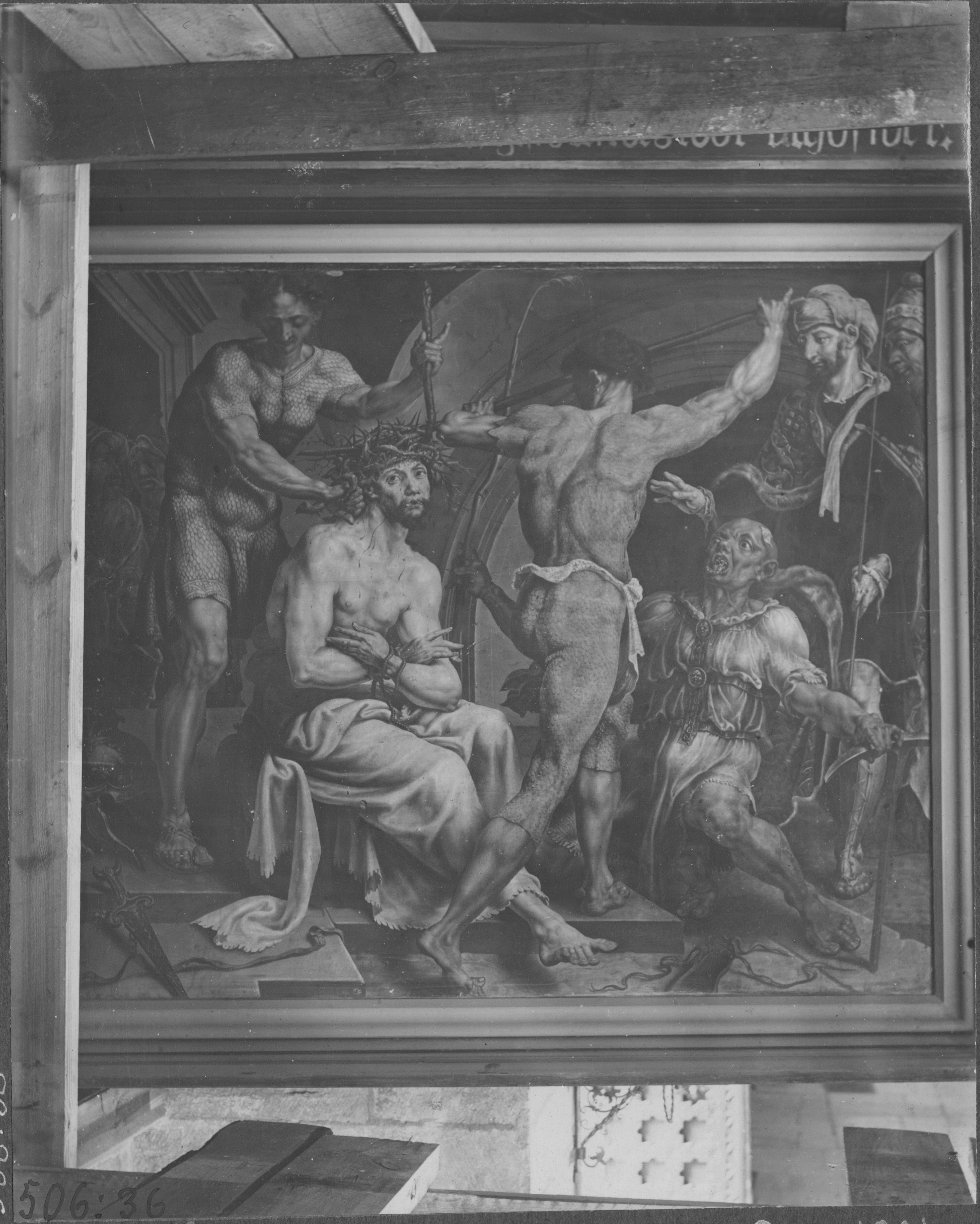 Beskrivning: Altarskåp av ek, krederat och målat, detalj. Av Maerten van Heemskerck 1538-1543. Före konservering.