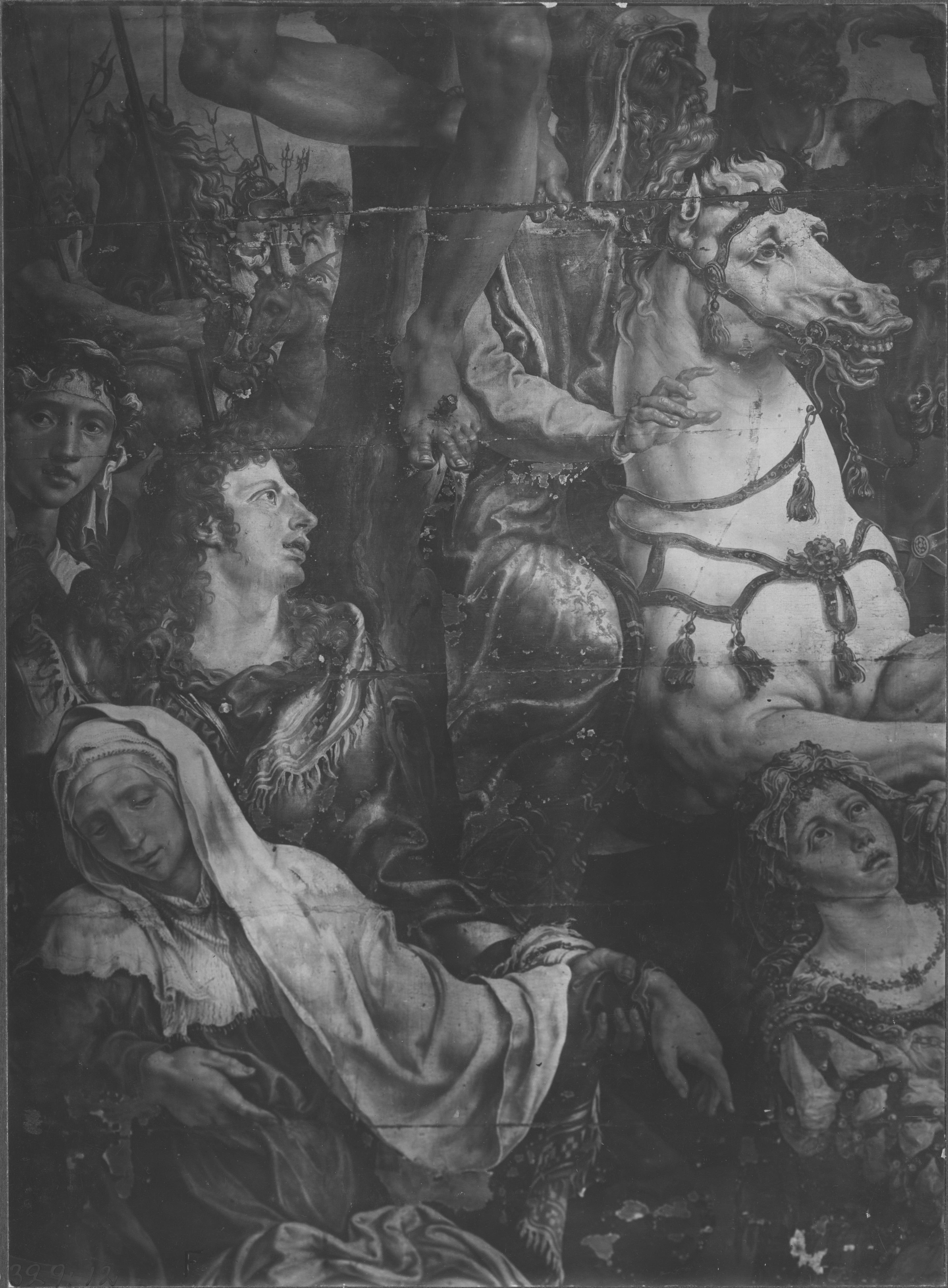 Beskrivning: Altarskåp av ek, krederat och målat, detalj. Av Maerten van Heemskerck 1538-1543. Före konservering.