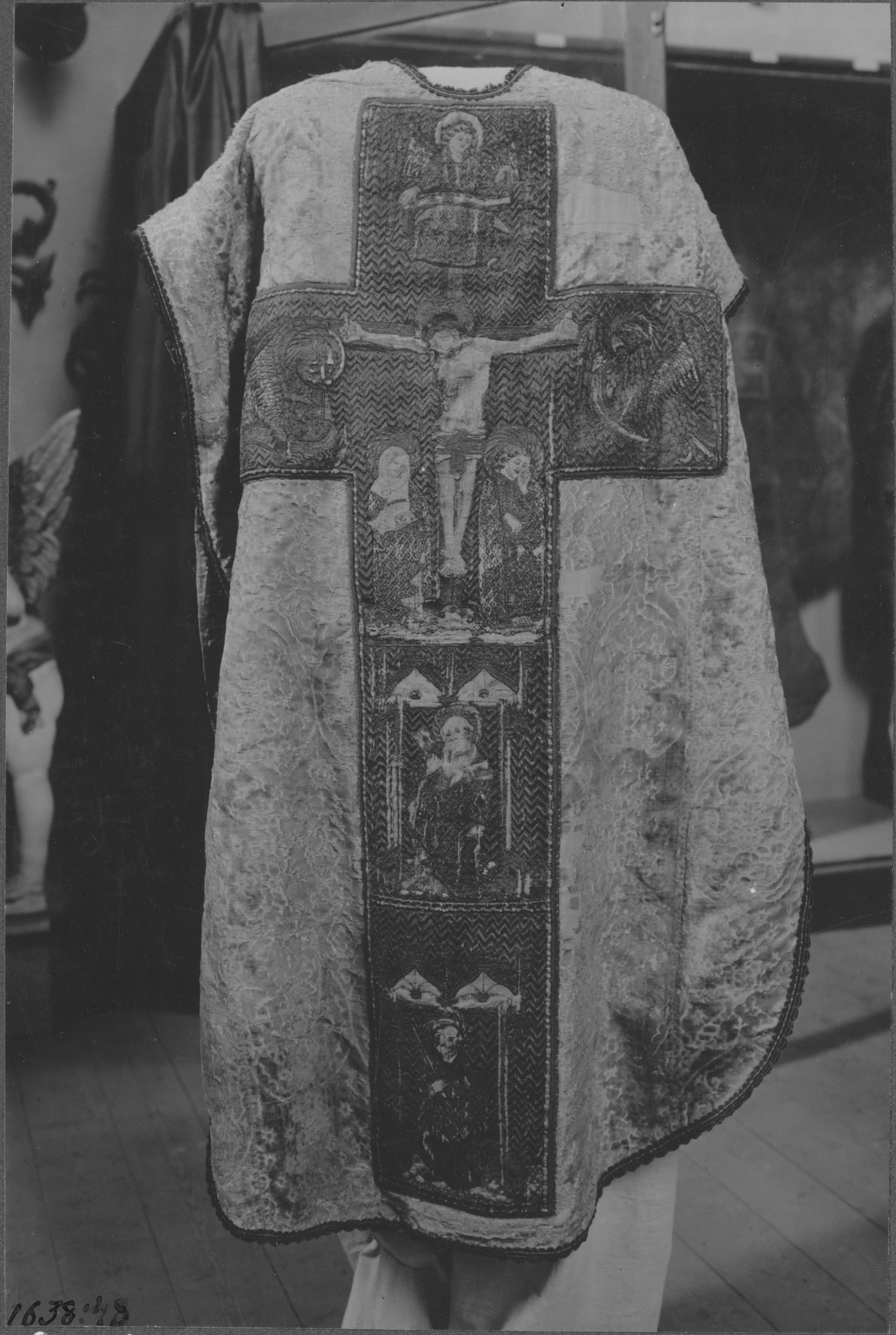 Beskrivning: Mässhake från 1692, ryggsidan med figurbroderat kors. Snabbinventering.