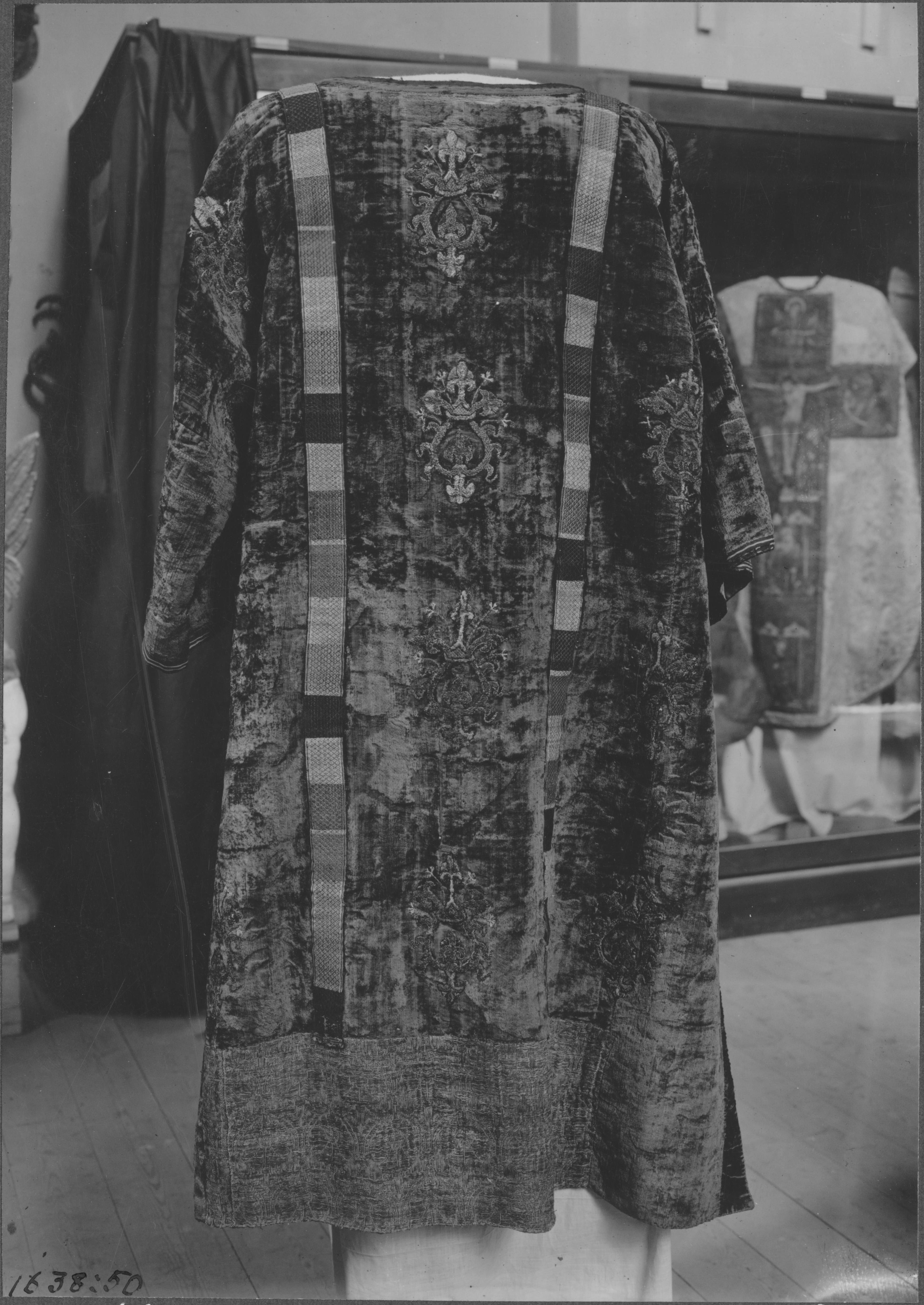 Beskrivning: Tunika av rödviolett sammet. Stormönstrad. Ryggsidan. Början av 1400-talet. Snabbinventering.