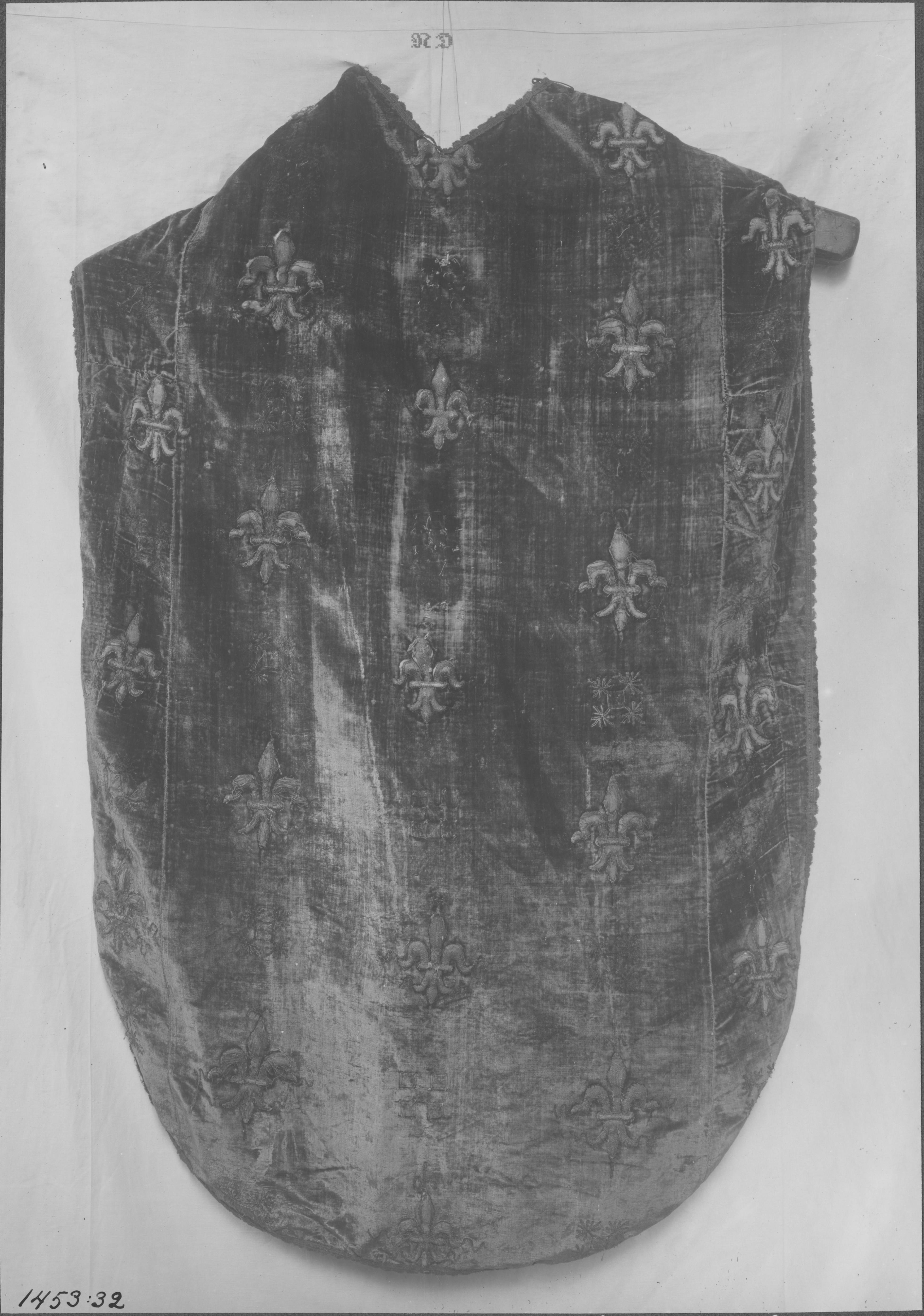 Beskrivning: Mässhake sydd 1692 av en senmedeltida tunika. Korset av massivt silver saknas. Ryggsidan.