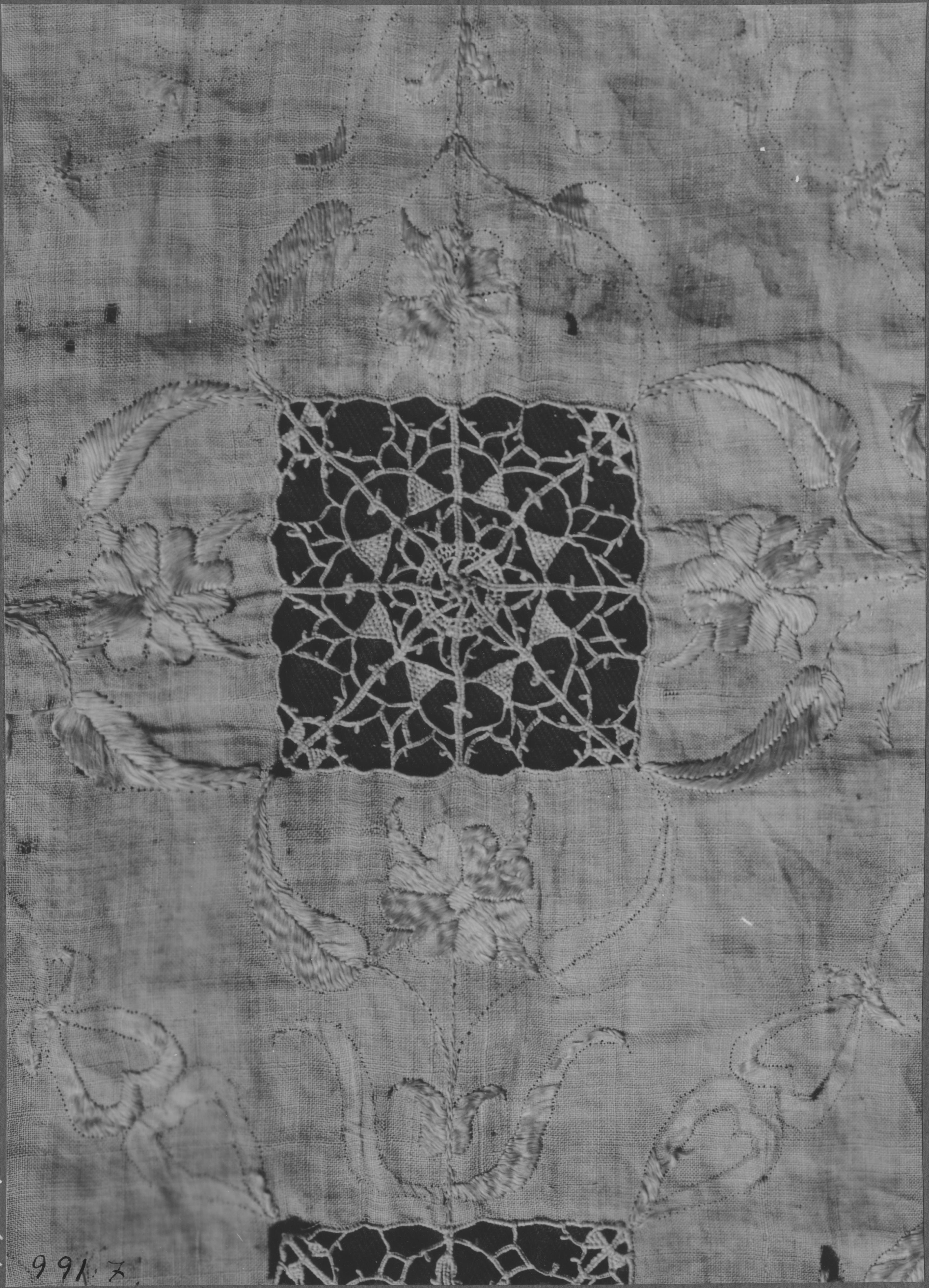Beskrivning: Kalkduk. Linnekammarduk med silke- och guldbroderi, detalj. Sannolkit 1600-talets förra hälft.