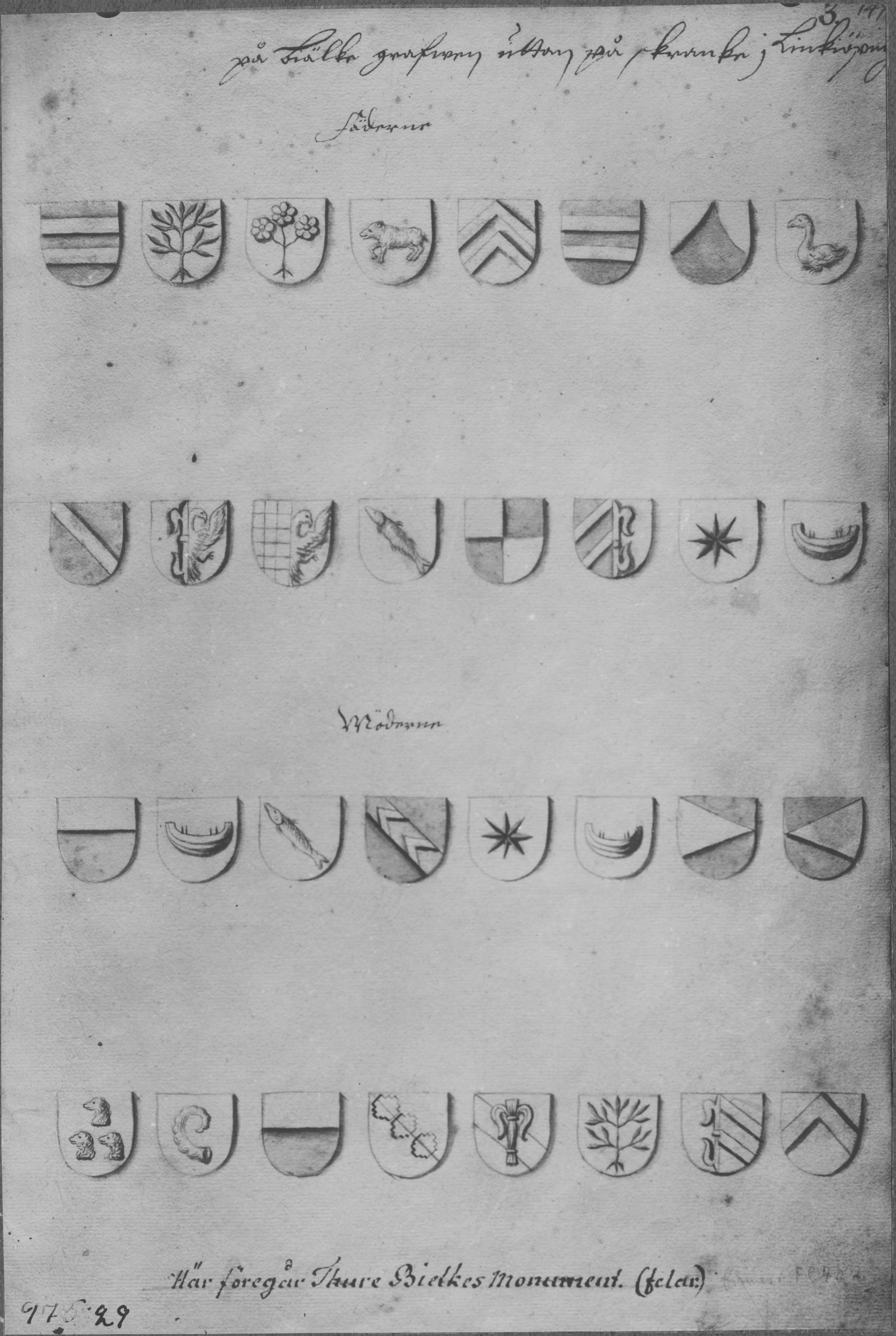 Beskrivning: Anvapen. Ur Nescher:"Ritade kyrkor i Wadstena län". Text:"Här föregår Thure Bielkes Monument". Ritat av Elias Brenner 1669-1670.