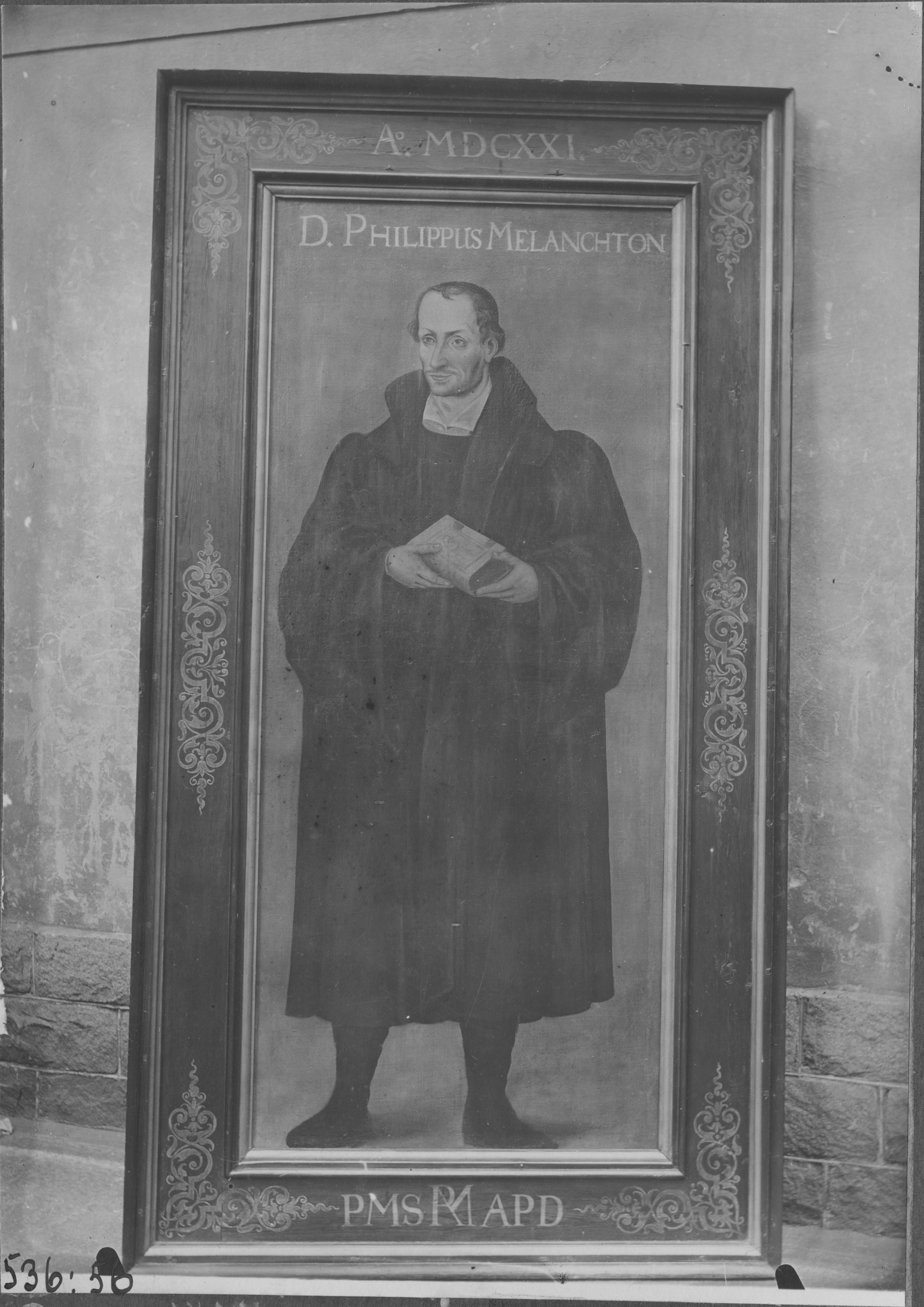 Beskrivning: Porträtt föreställande Philip Melanchton. Skänkt 1621 av Peder Mattsson (Stiernfelt). Efter restaurering.