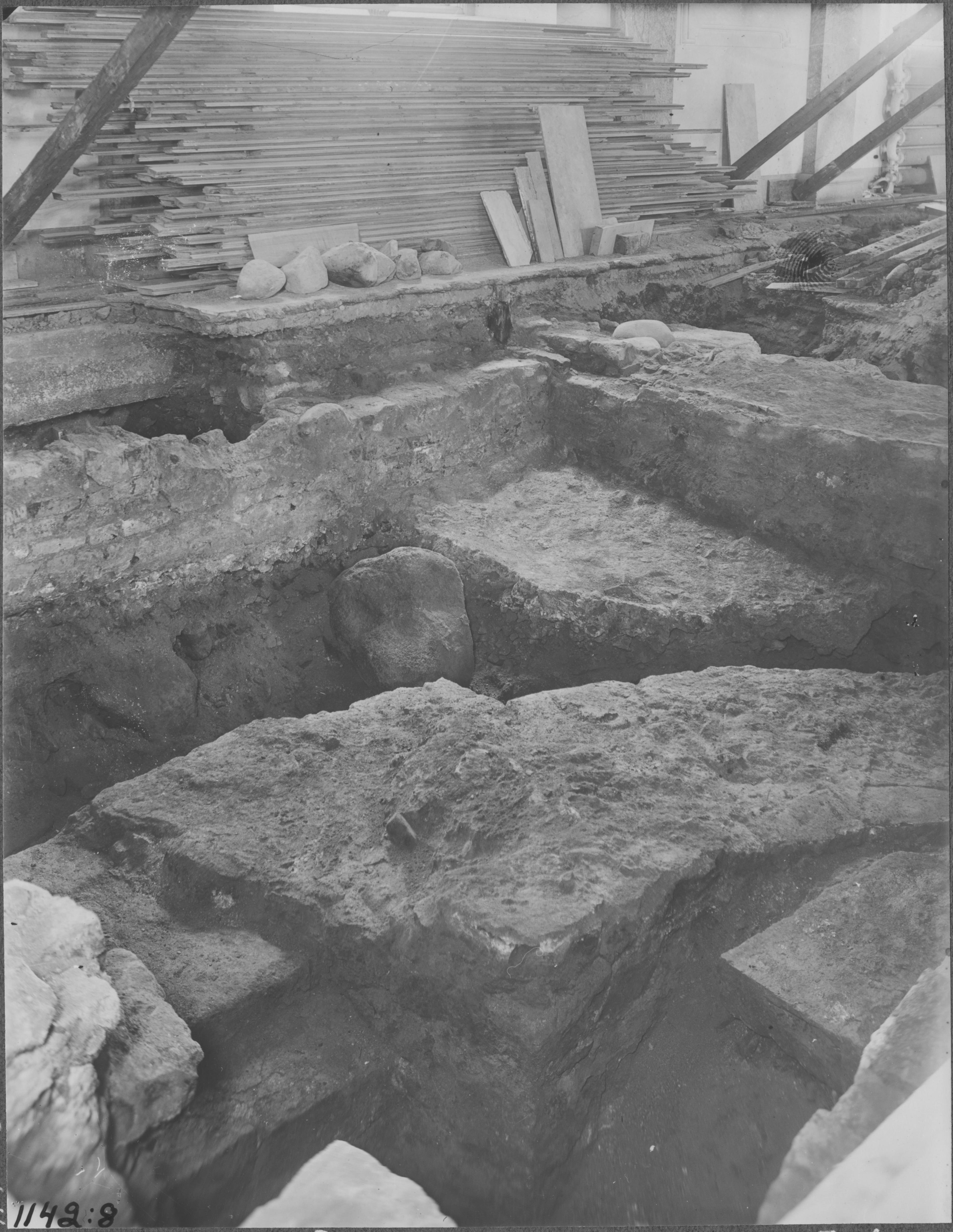 Beskrivning: Koret och det tillbyggda koret i 1100-talskyrkan. Nordöstra hörnpelarna.
