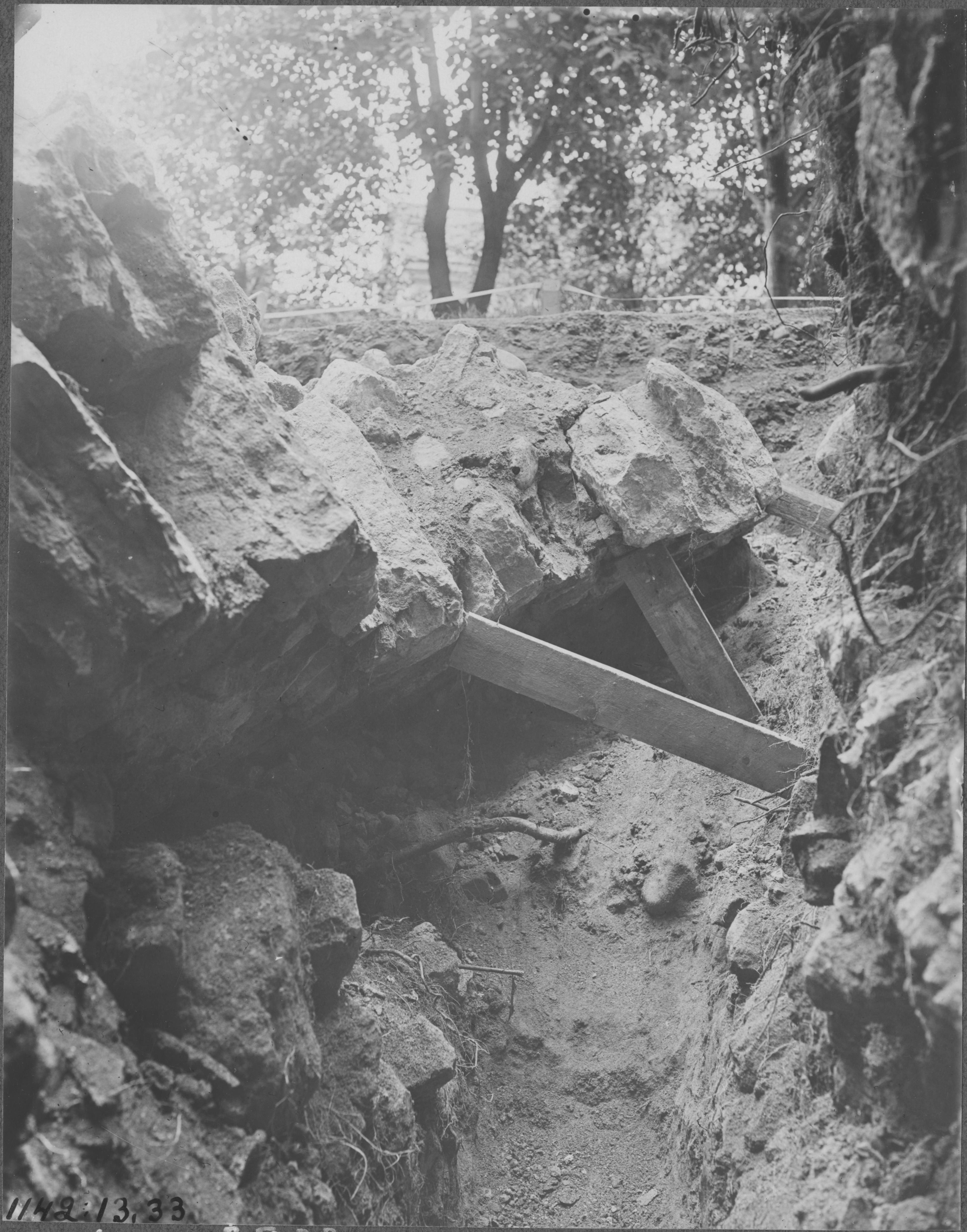 Beskrivning: Nedrasade murpartier söder om södra långhusportalen.