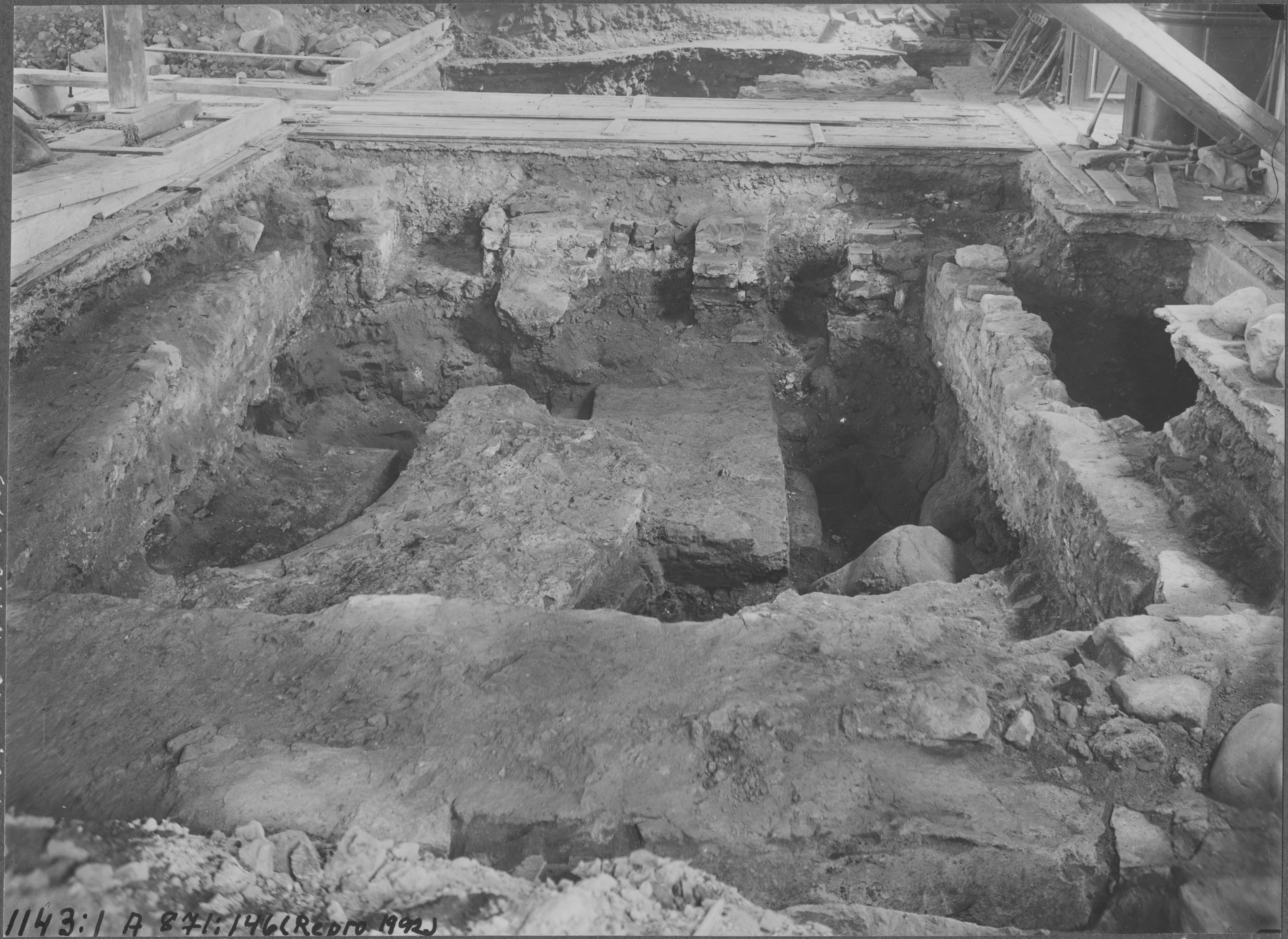 Beskrivning: 1100-talskyrkans grundmurar, nordöstra hörnet, vilket omsluts av fyrkant med tillstötande absidparti. Det utvidgade korets mur.