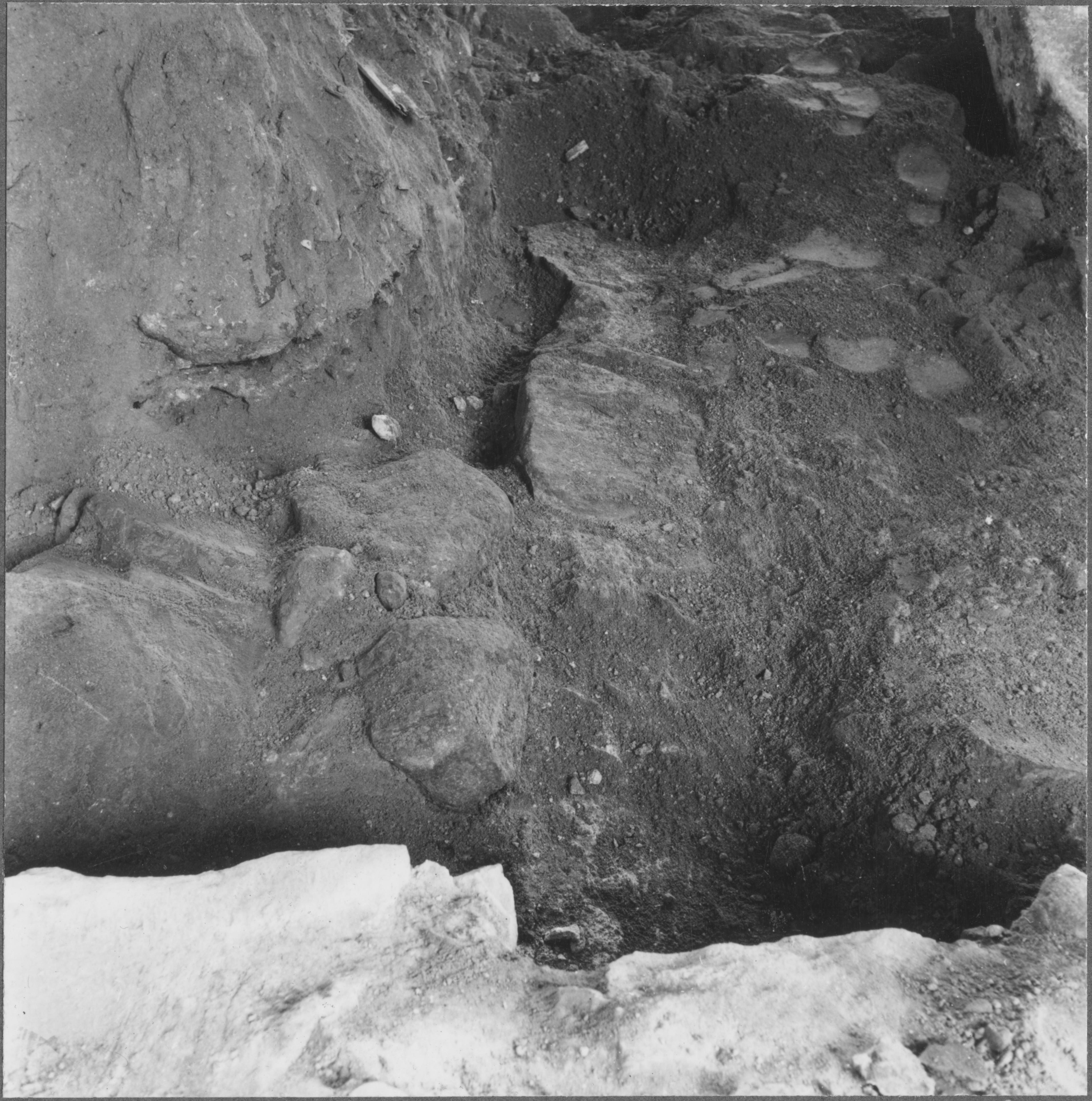 Beskrivning: Beskrivning: Korets ursprungliga östra mur med anslutning till norra muren samt senare tillkommen pilastergrund. Detalj.