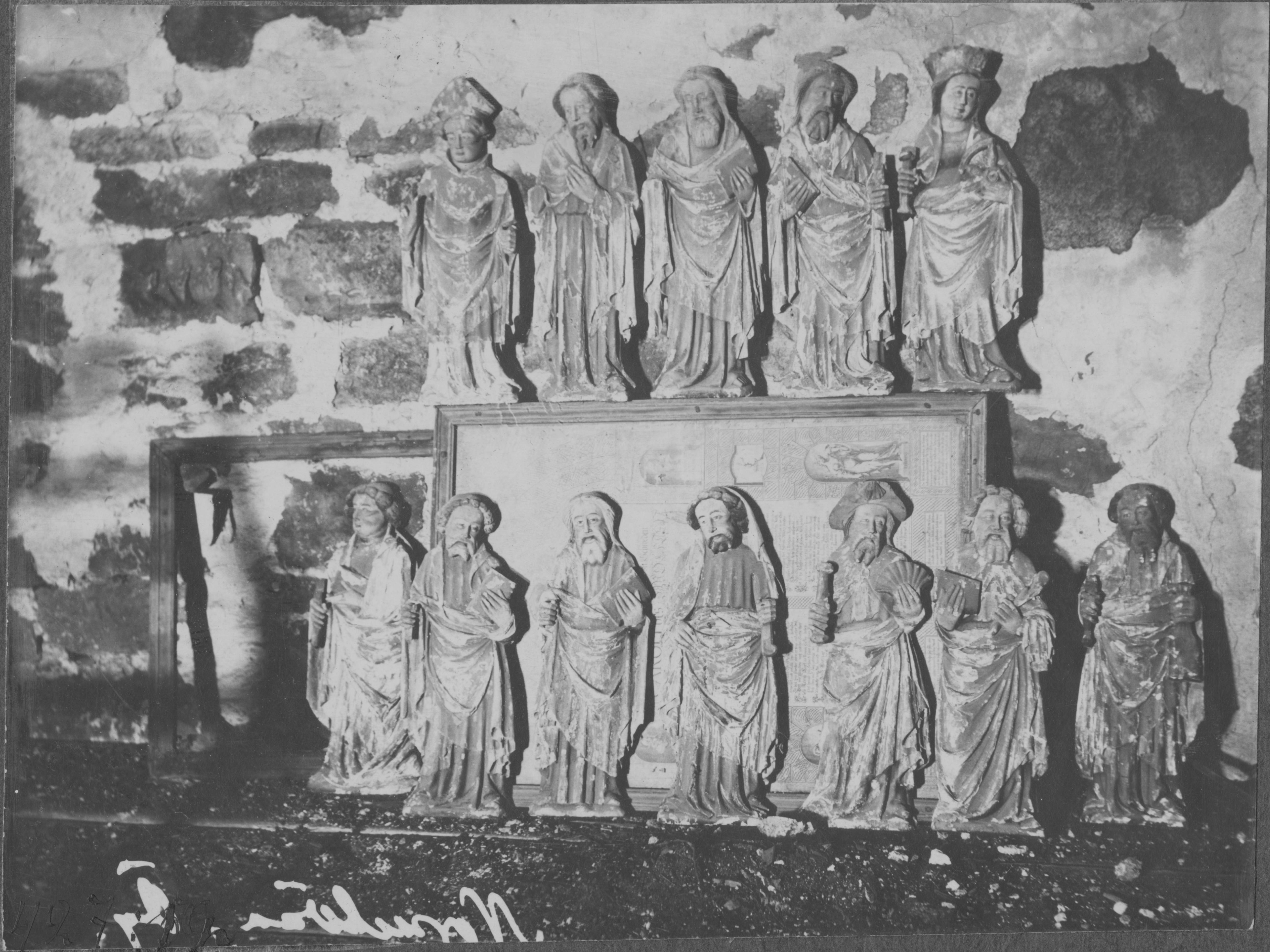 Beskrivning: Altarskåp i ek. Sexton figurer varav kristus som världsdomare och Maria i tillbedjande ställning. Figurerna i behåll, men färgen som varit mest i blått och guld är nästan avfallen. Av själva skåpet återstår endast flygeldörrarna. Nordtyskt arbete från omkring 1500. Detalj.