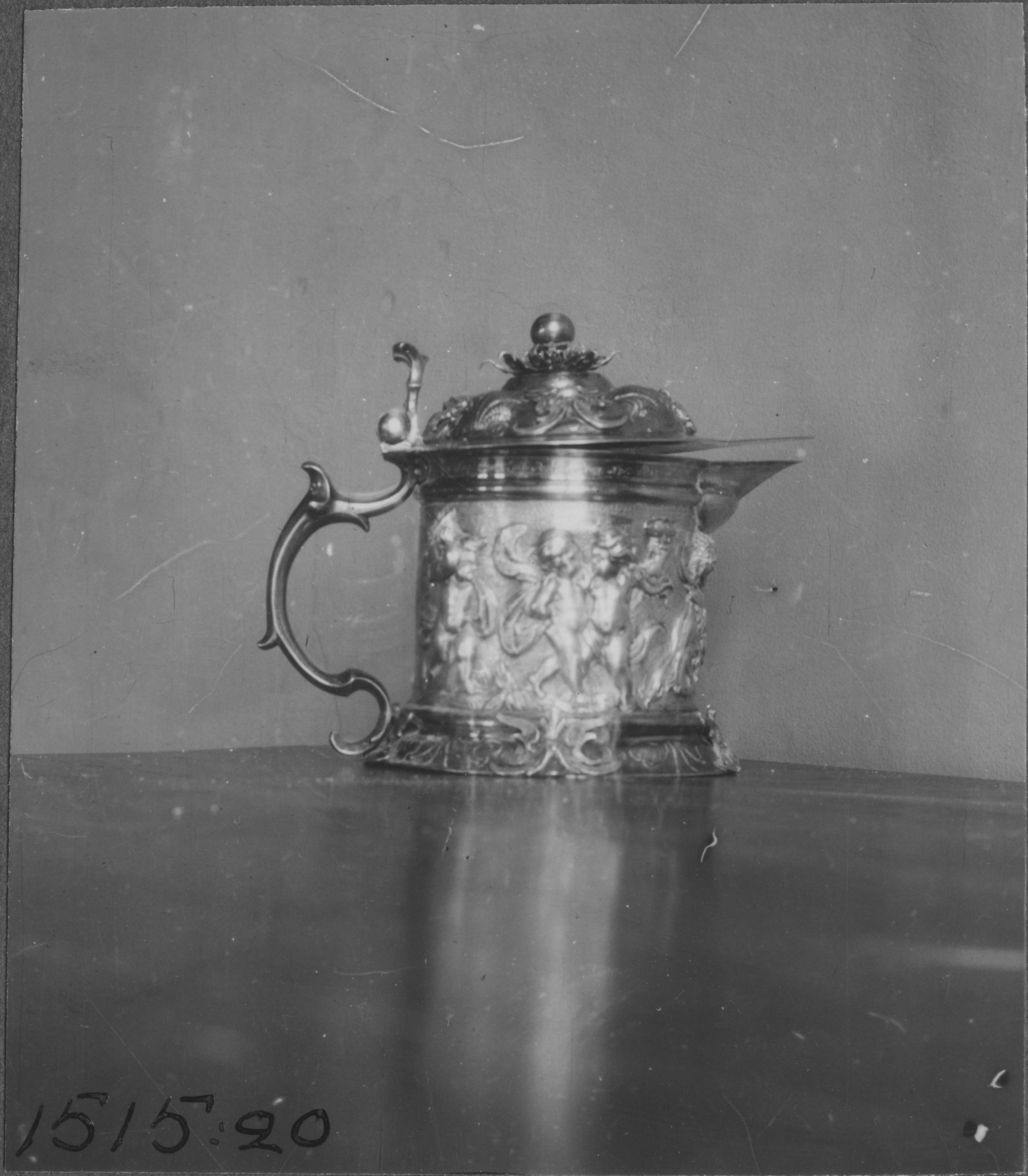 Beskrivning: Kommunionskanna av silver, delvis förgylld. Ornerad i drivet arbete med ett bacchuståg av putti. Locket ornerat med bland annata mascaroner. Utförd i Augsburg vid 1600-talets slut. snabbinventering.