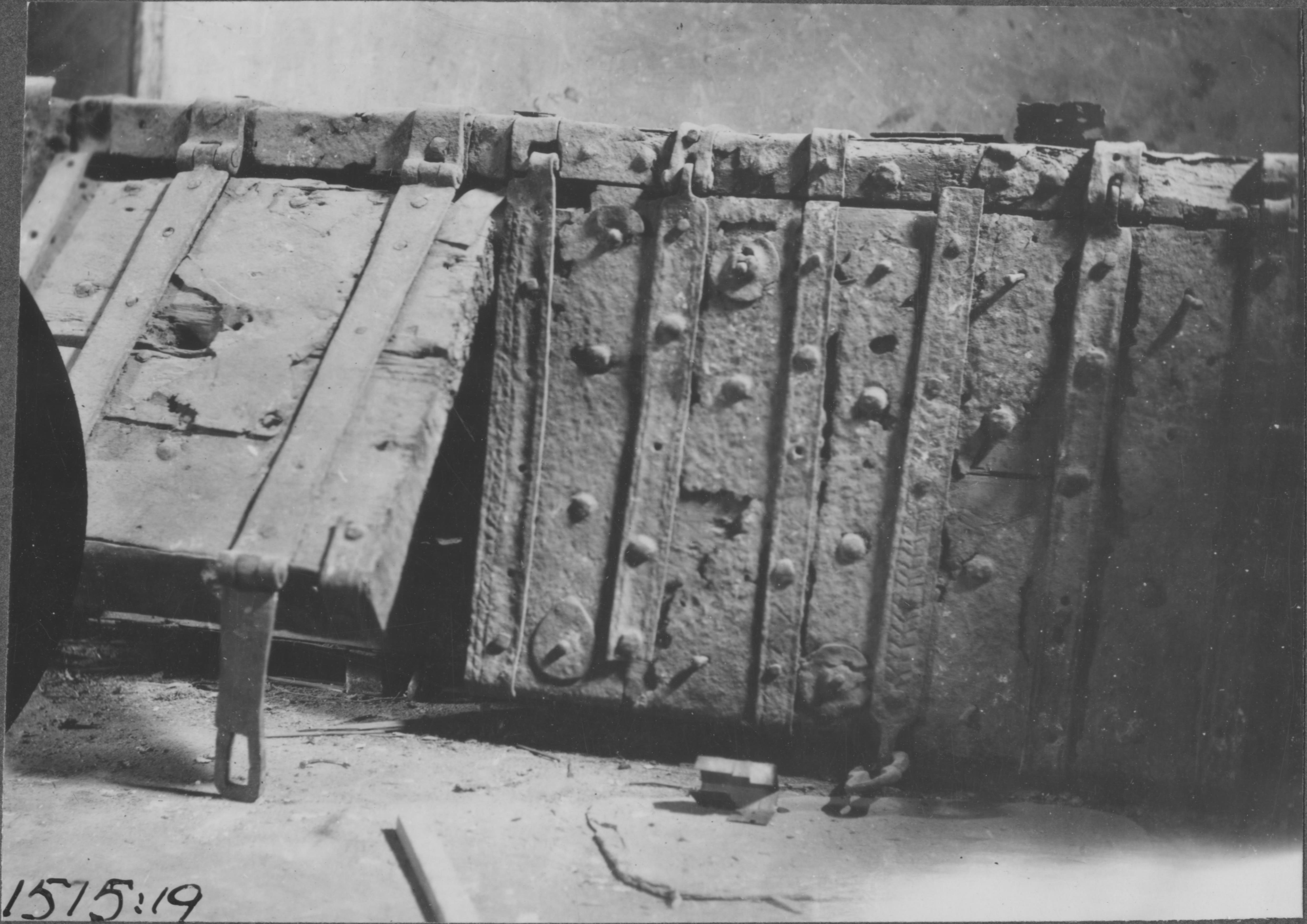 Beskrivning: Kista av plåt med järnbeslag och hänglås samt ett inlås. Snabbinventering.