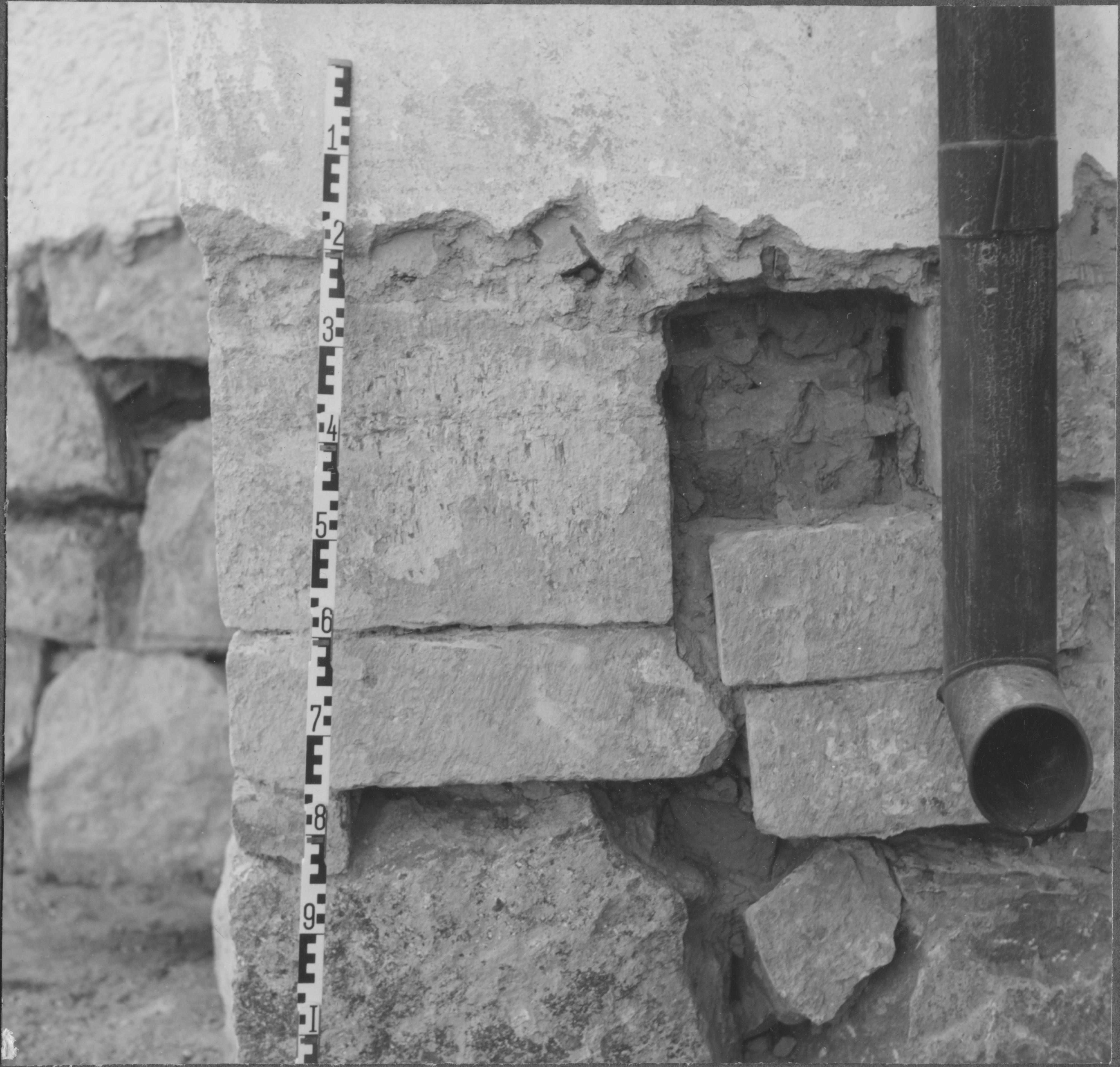 Beskrivning: Kalksten, medeltida huggen. Nordöstra hörnet av långhuset.