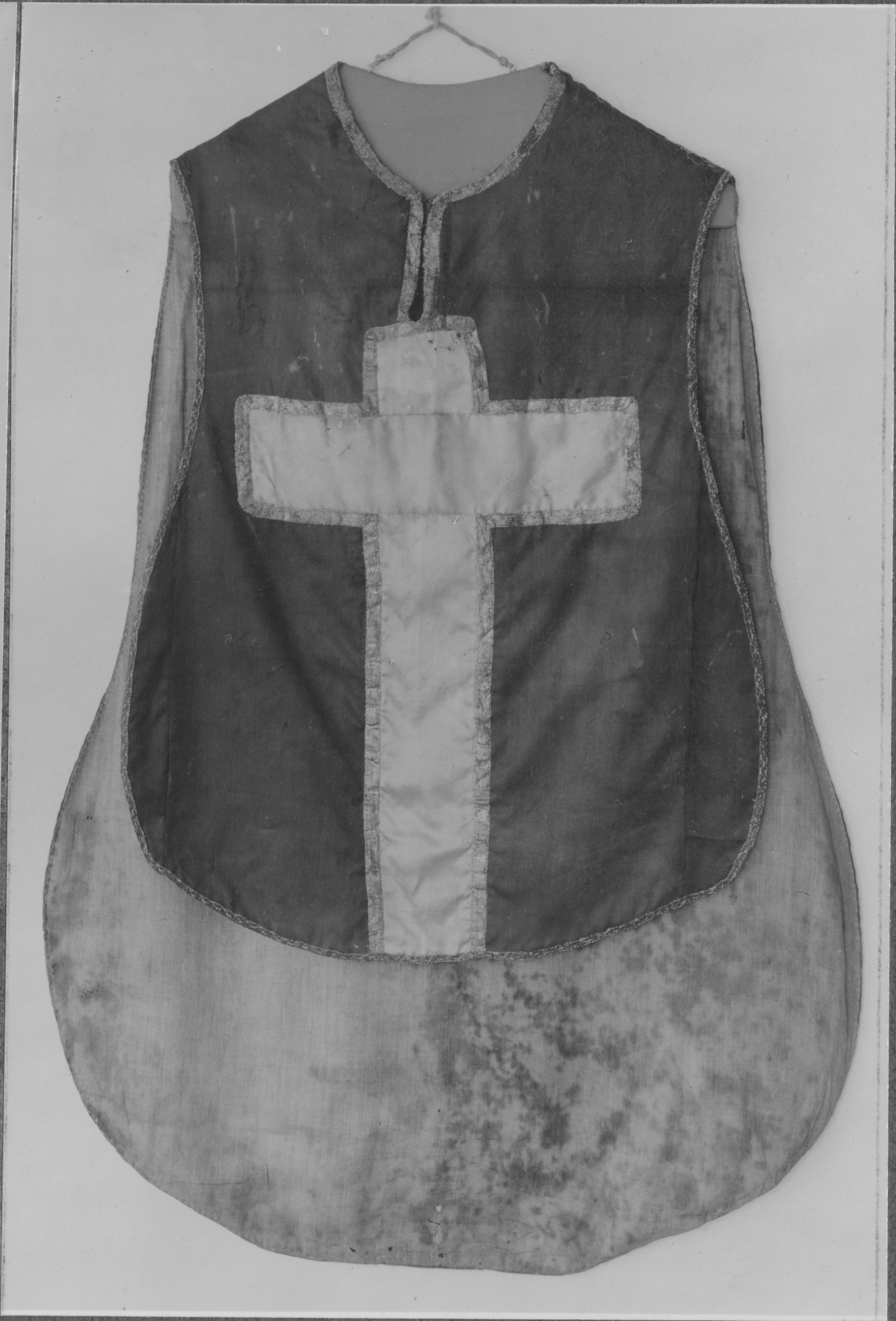 Beskrivning: Mässhake av svart atlas. Bröststycket med kors av gult siden. Efter konservering.