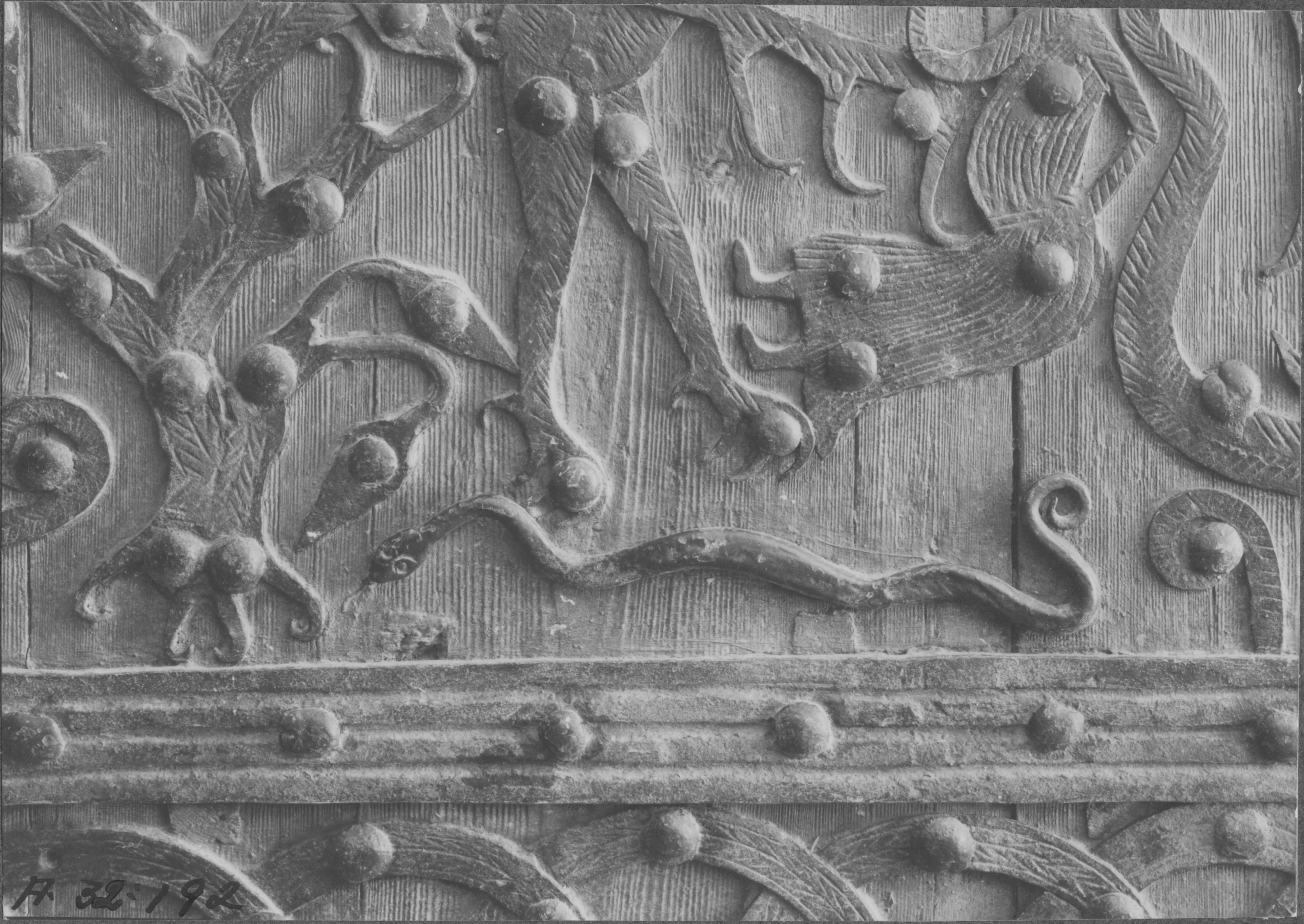 Beskrivning: Sydportalen, Rogslösadörren, en medeltida järnbeslagen trädörr med figurframställningar. Dendrodaterad till 1275. Detalj. Kyrkans huvudingång.