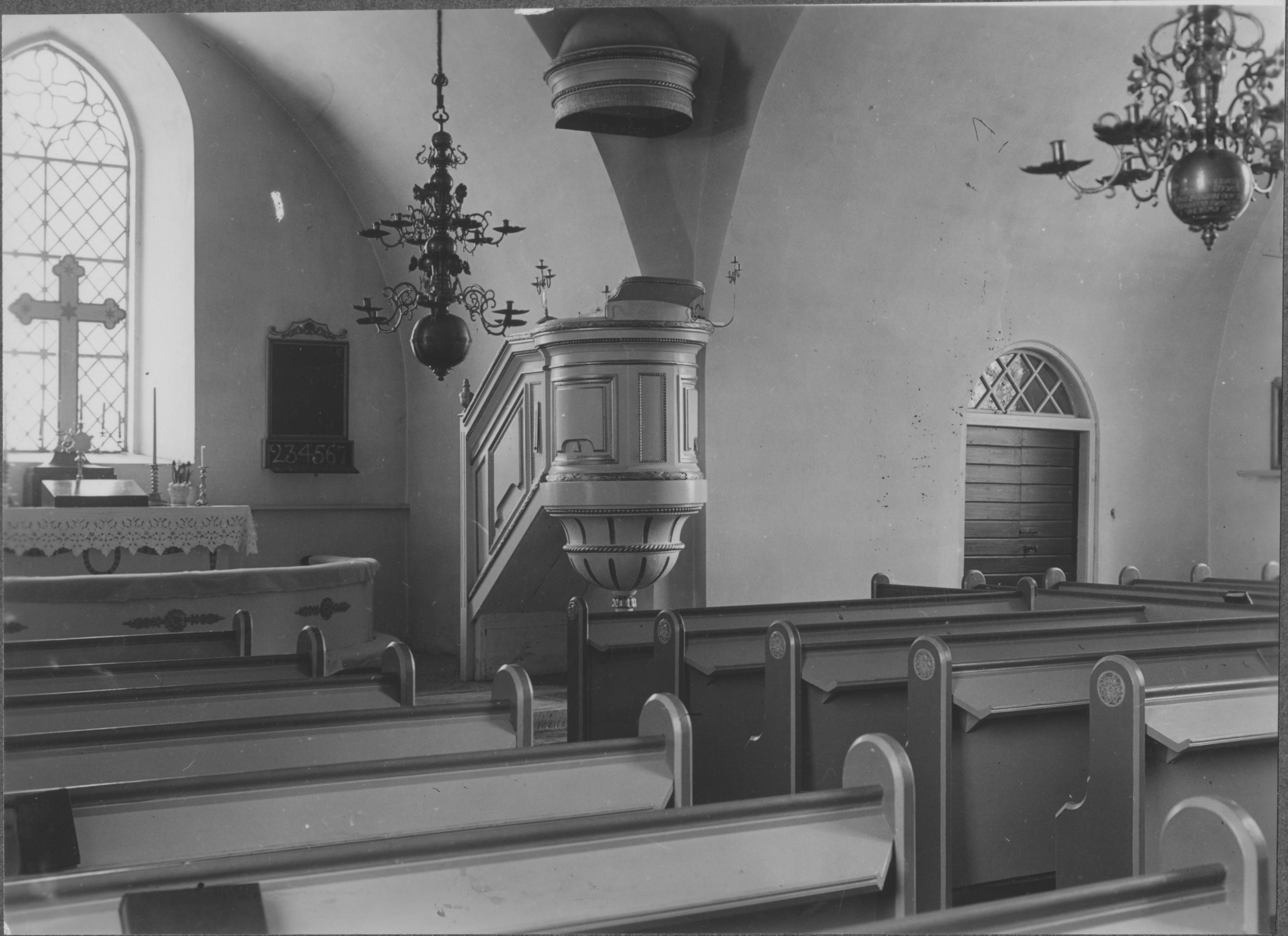 Beskrivning: Predikstolen från 1797. Gustaviansk utfromning, målad i grått med förgyllning.
