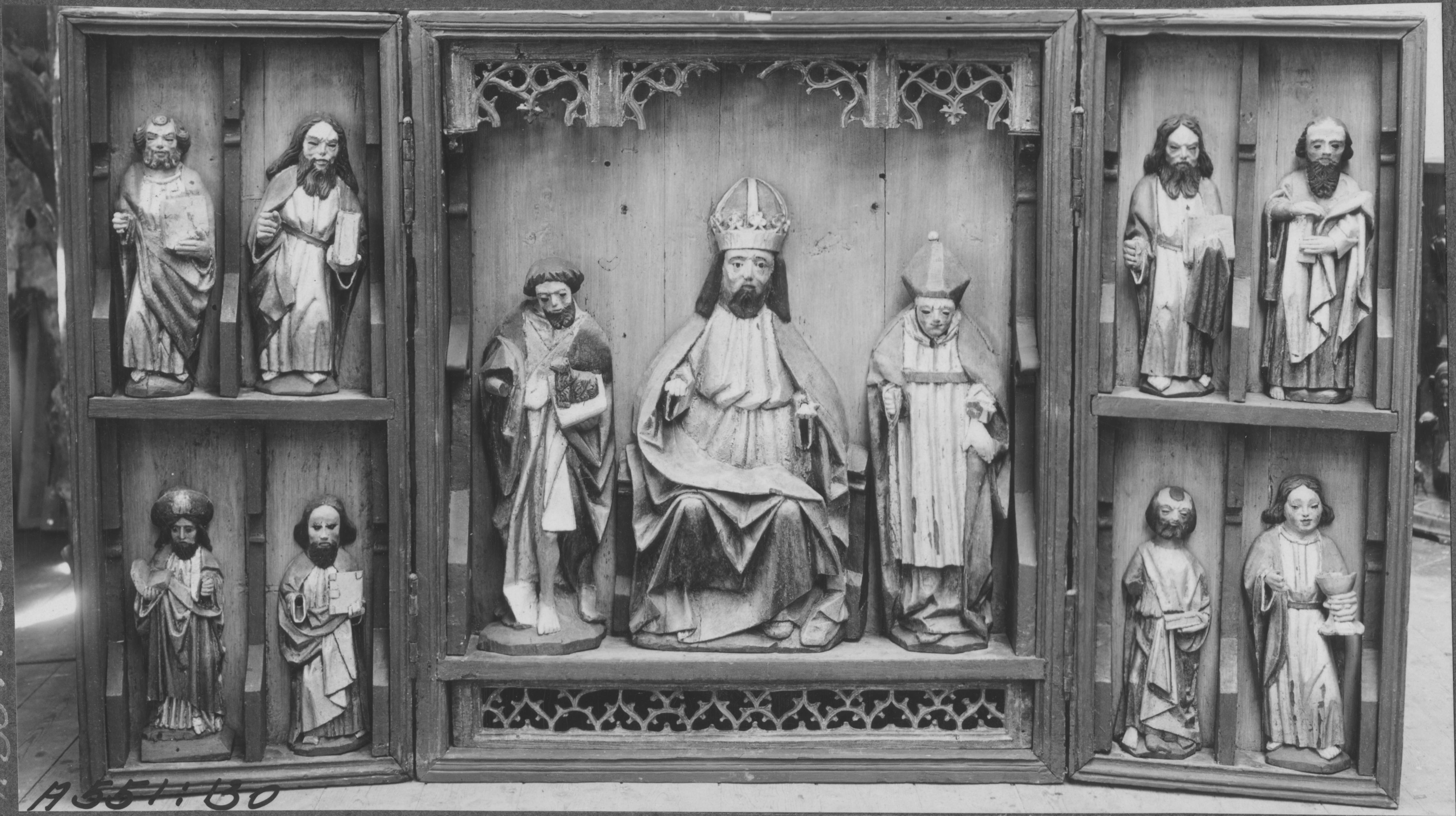 Beskrivning: Altarskåp med skulpterade figurer i corpus och flyglarna. I corpus Kristus på tronen, i flyglarna apostlar och helgon. Defekt. 1400-talets slut. Efter restaurering.