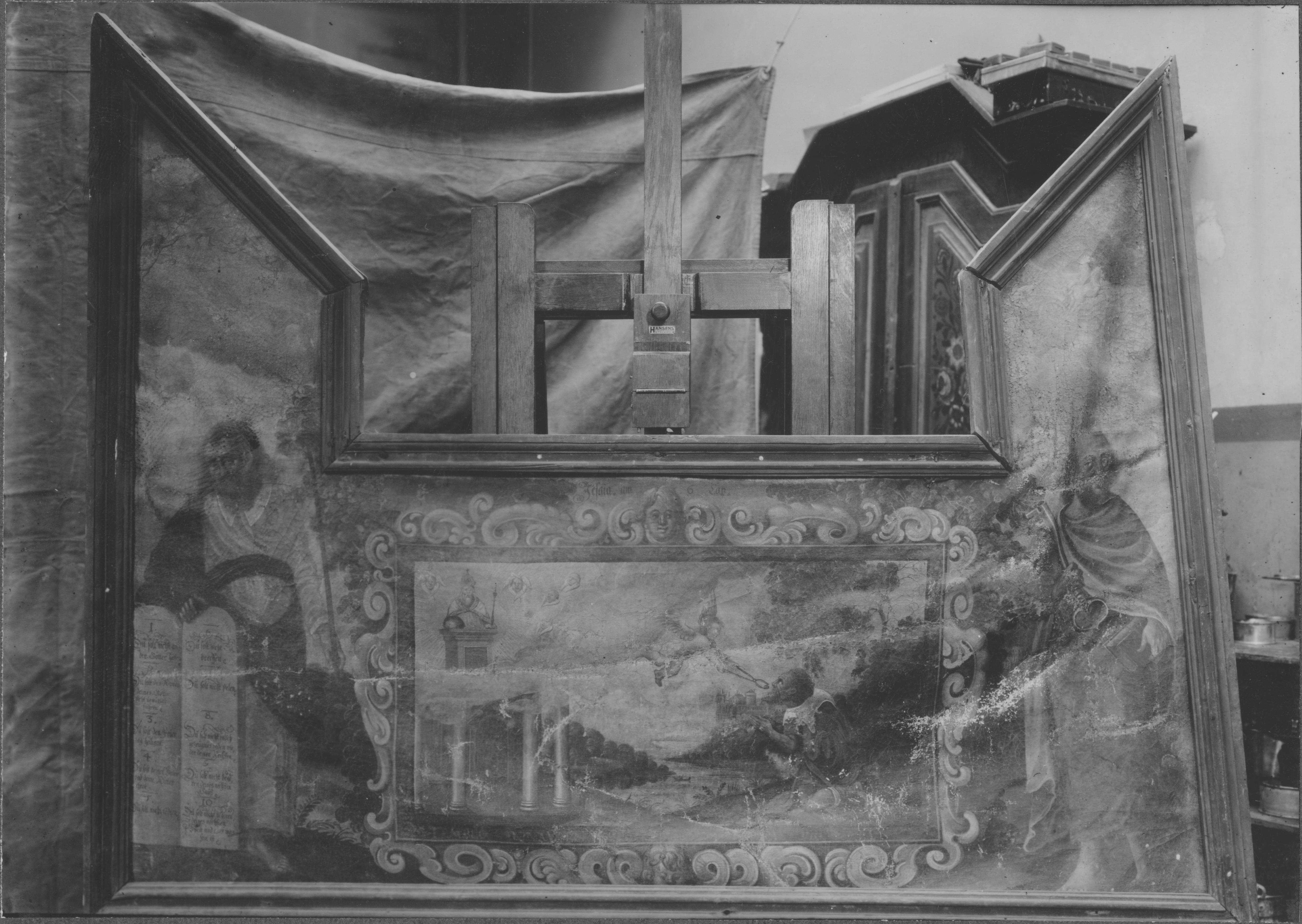 Beskrivning: Tavla föreställande Herrens profetia till Jesaia. I mitten profetian, på flyglarna Moses och Petrus. Olja på duk. På flyglarna uppskjutande trapetser. Omkring 1600. Före konservering 1936.