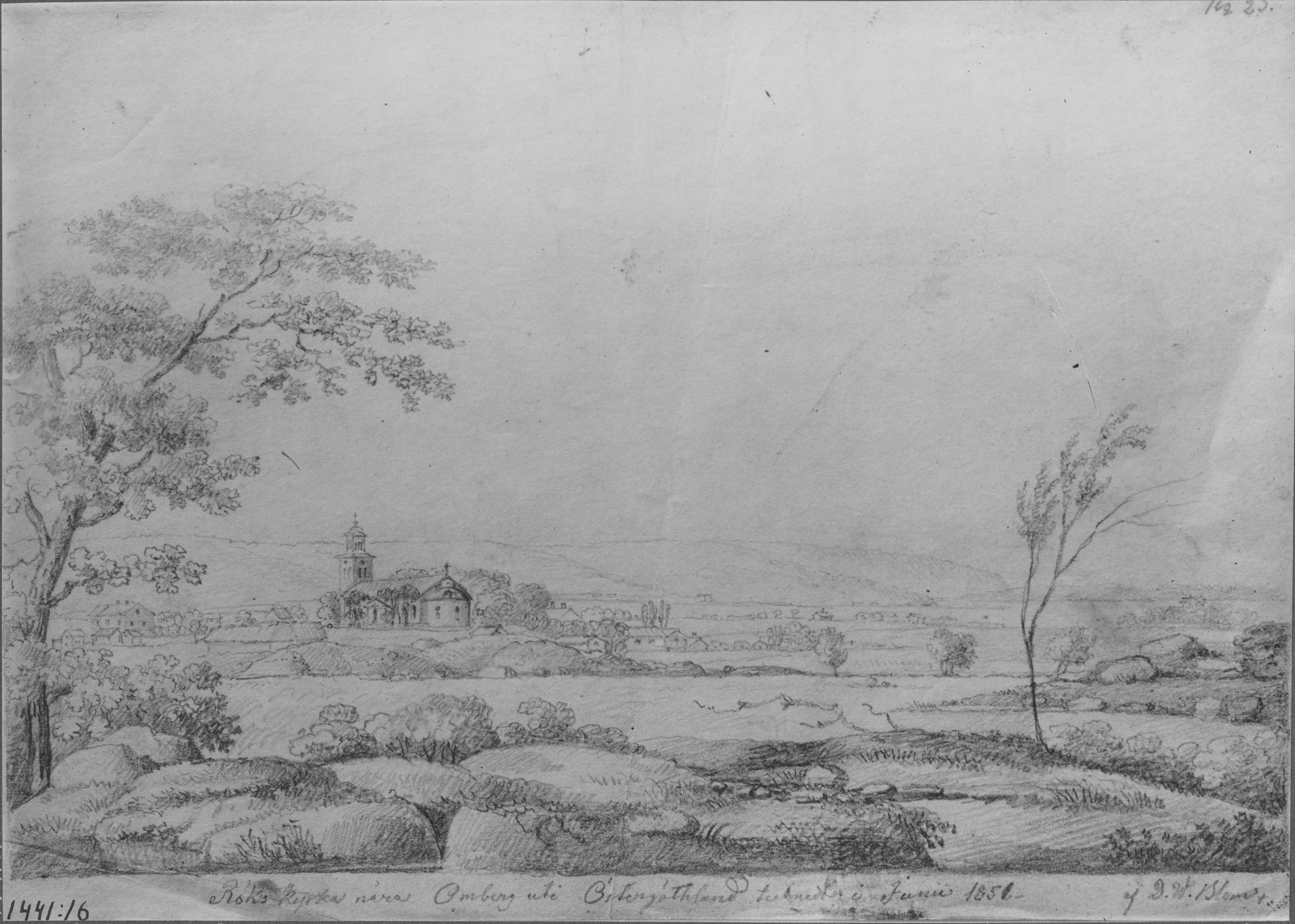 Beskrivning: Kyrkan från sydost. Efter en blyertsteckning av D.W. Blom