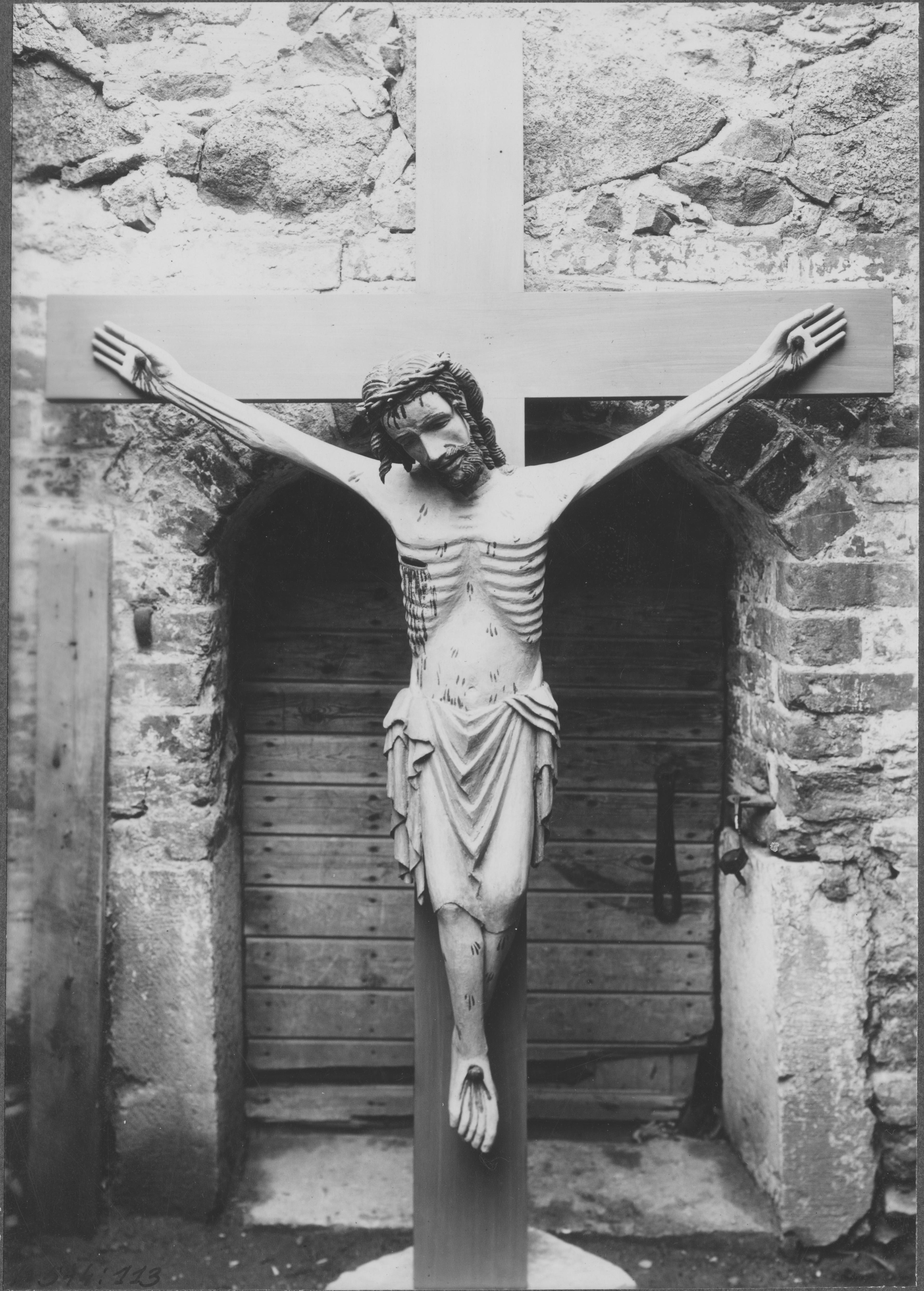Beskrivning: Triumfkrucifix av trä, krederat och målat. Från 1400-talets mitt, korset senare. Efter konservering 1937.