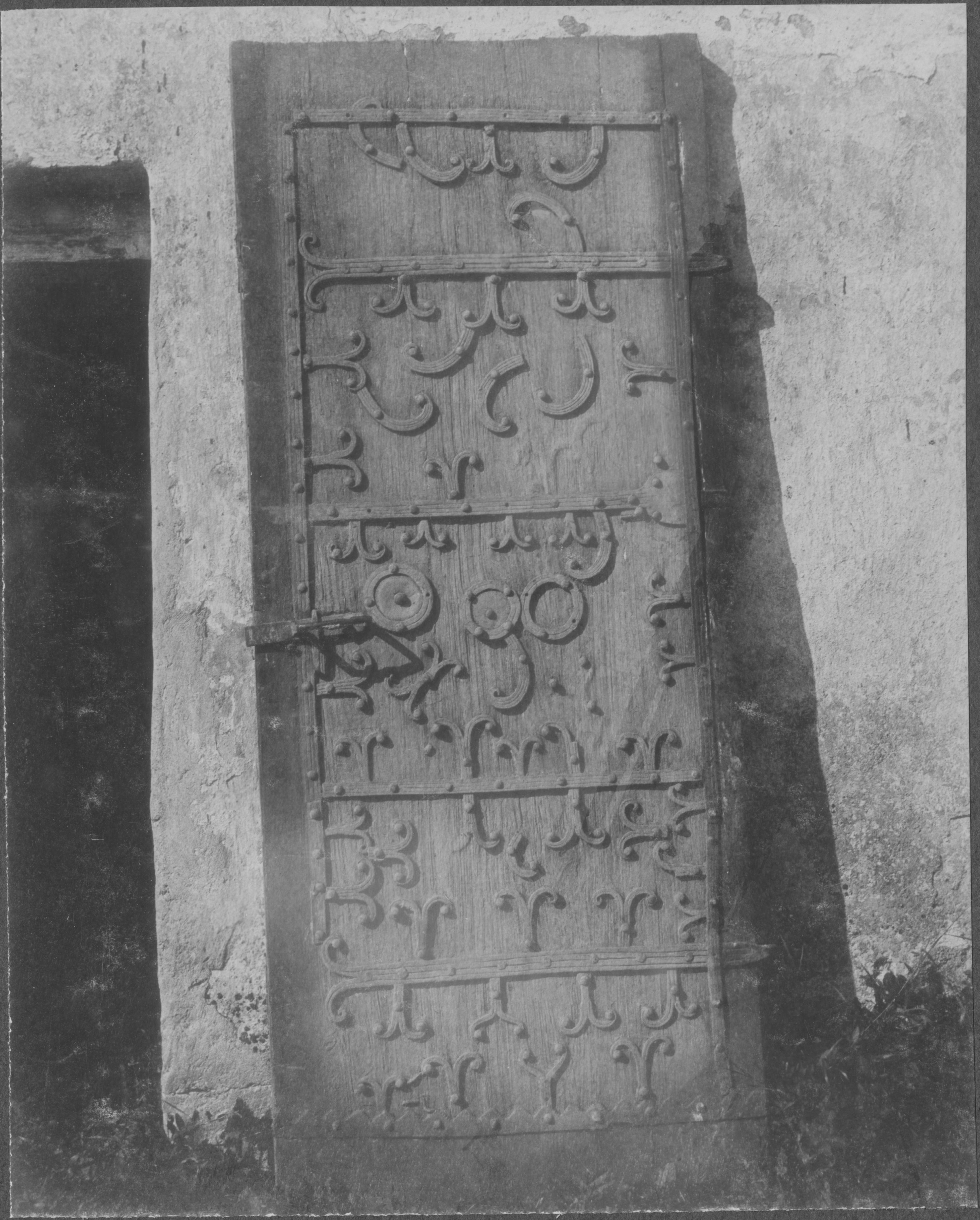 Beskrivning: Järnbeslagen dörr. Har sannolikt suttit i portalen, förvaras i koret.