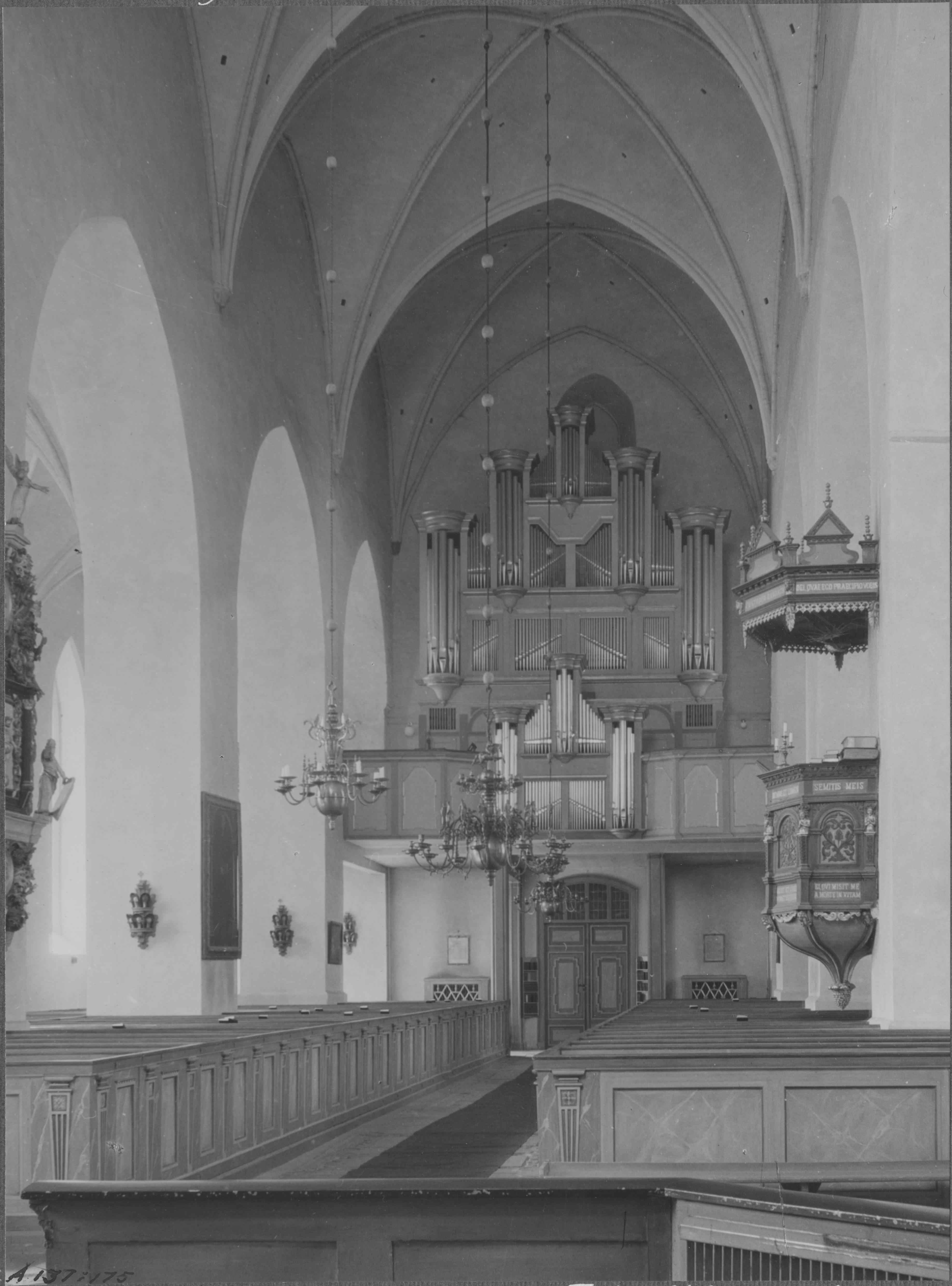 Beskrivning: Orgel av Wahlberg och Wåhlander 1772. Orgelns gamla fasad med nya ryggpositivet.