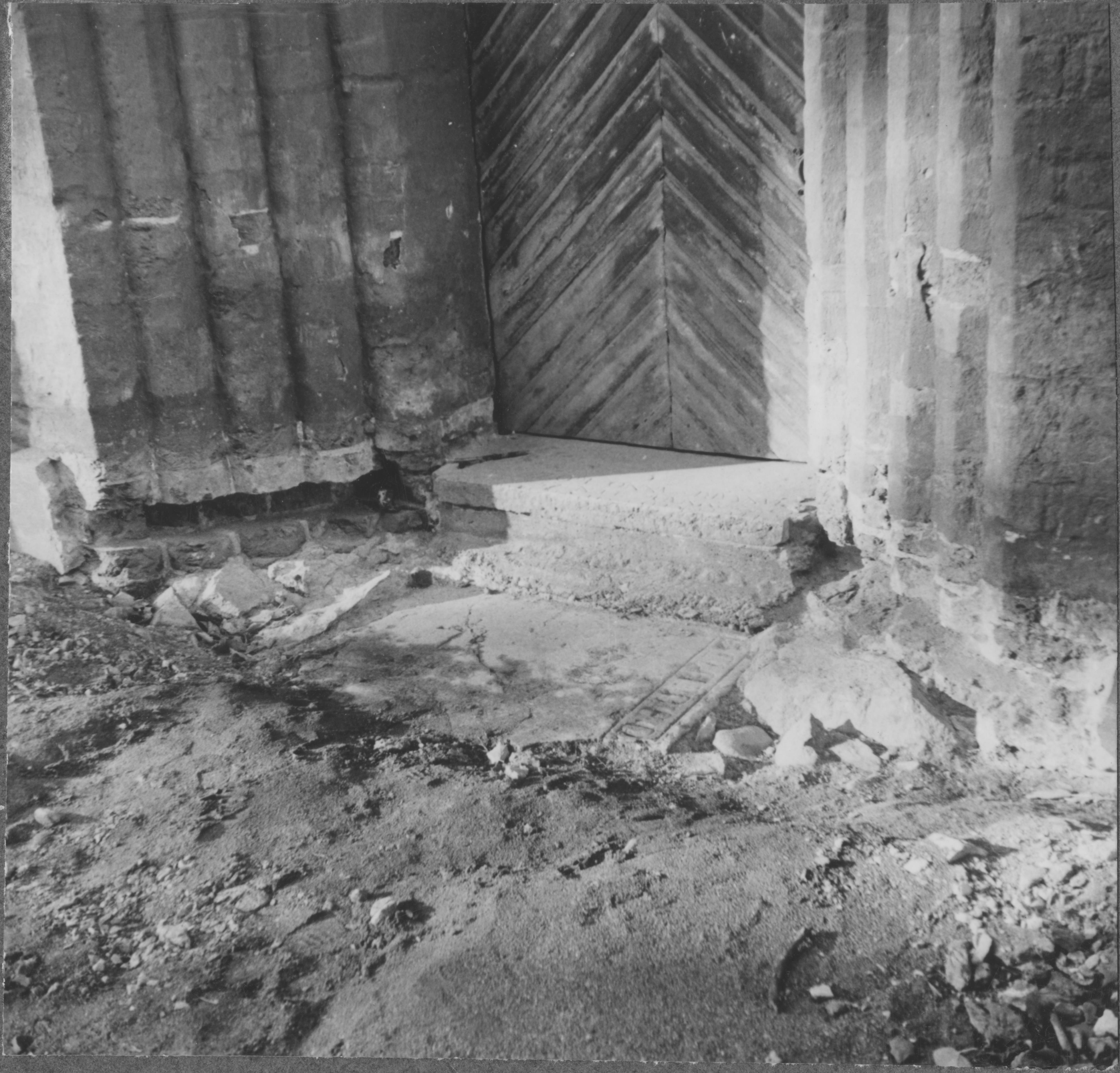 Beskrivning: Blottad cementsockel och blottad medeltida gravsten. Grävningar under ombyggnad.