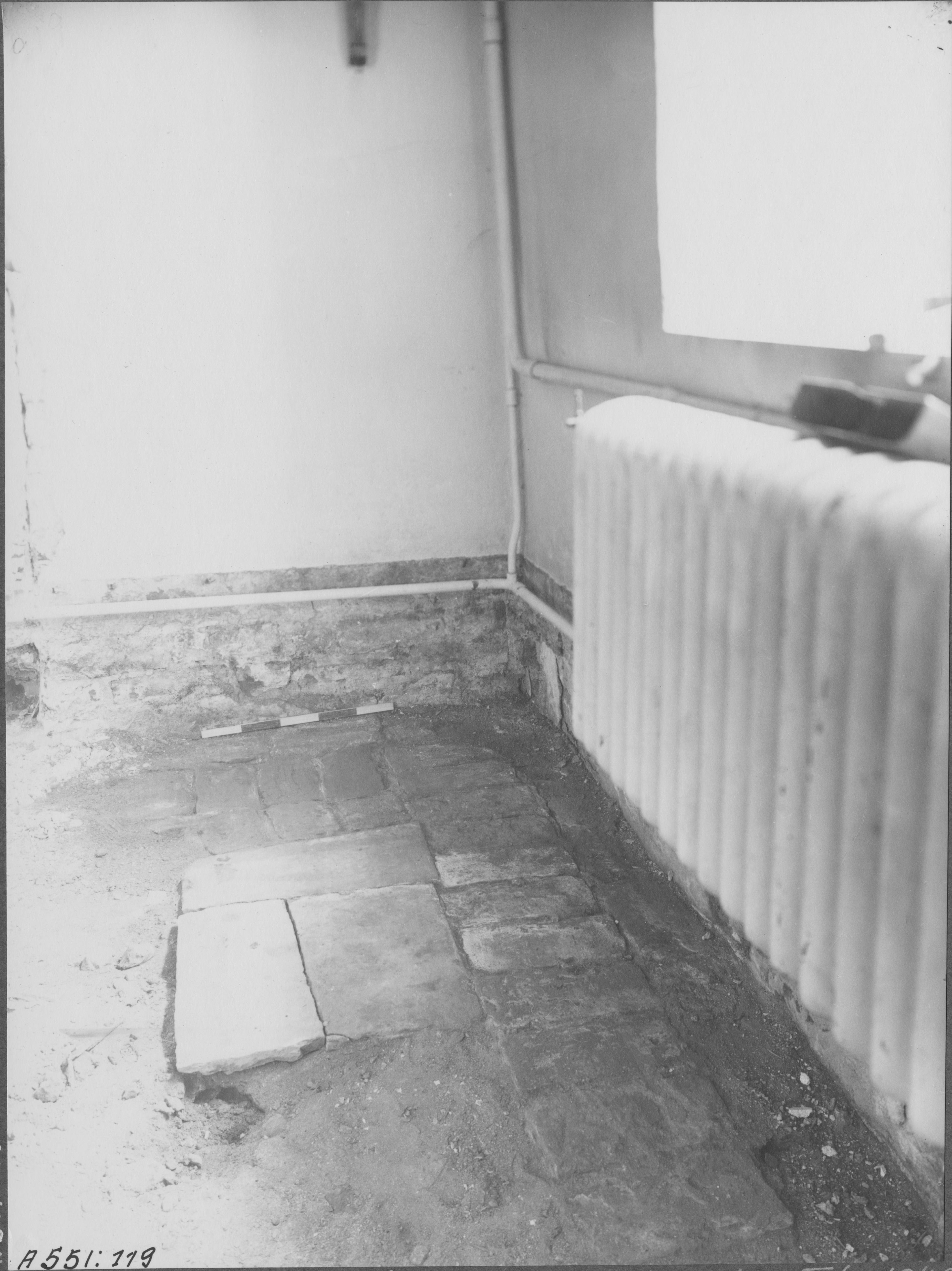 Beskrivning: Sakristian. Byggnadsarkeologisk undersökning under golvet. Flera äldre golvnivåer framkom varav det äldsta daterades, med hjälp av brakteat, från 1300-talets mitt. Nordvästra hörnet.