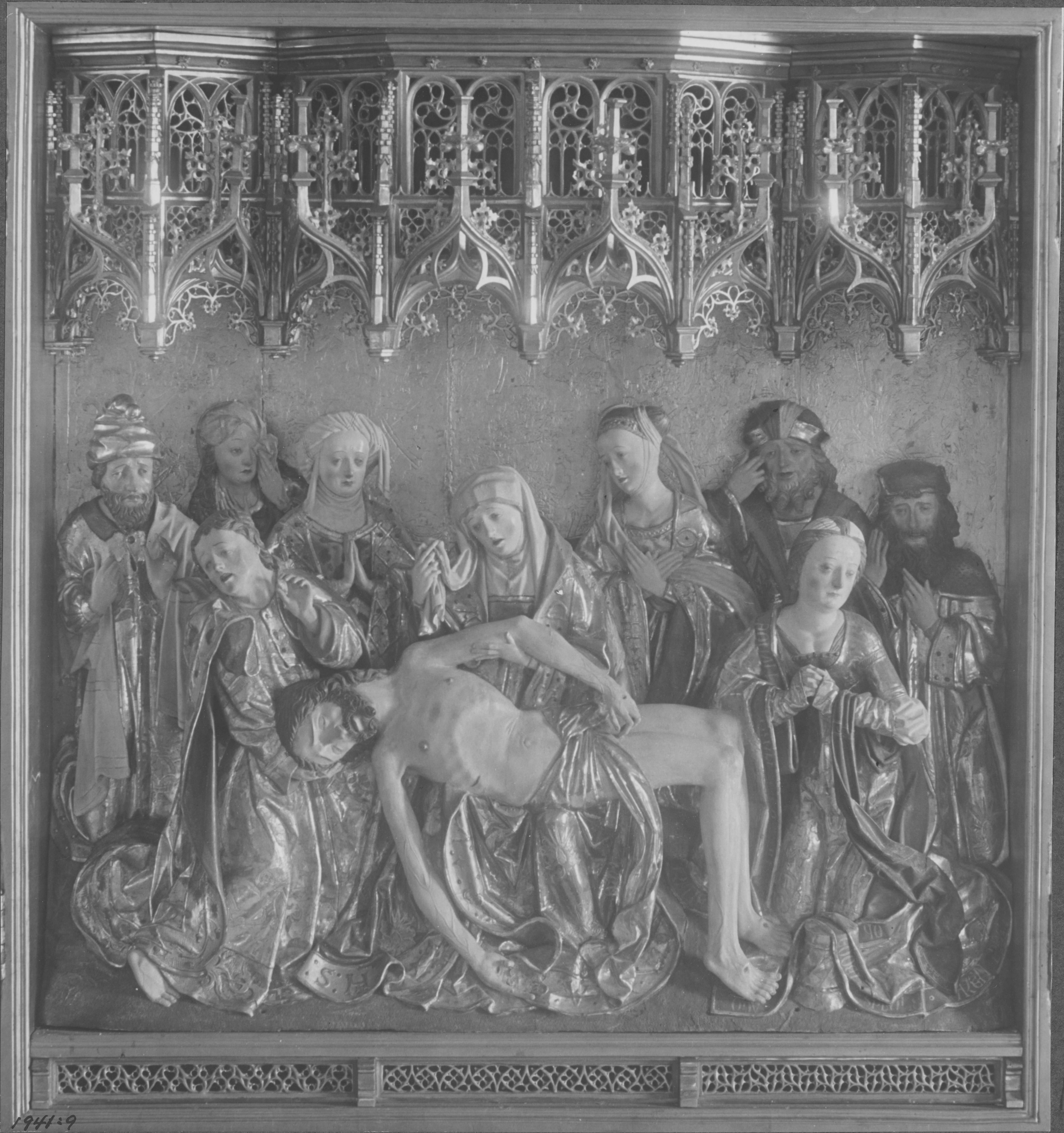 Beskrivning: Altarskåp av ek, krederat, förgyllt och målat. Corpus med en framställning av Kristi begråtande. Nordtyskt arbete från 1500-talet.