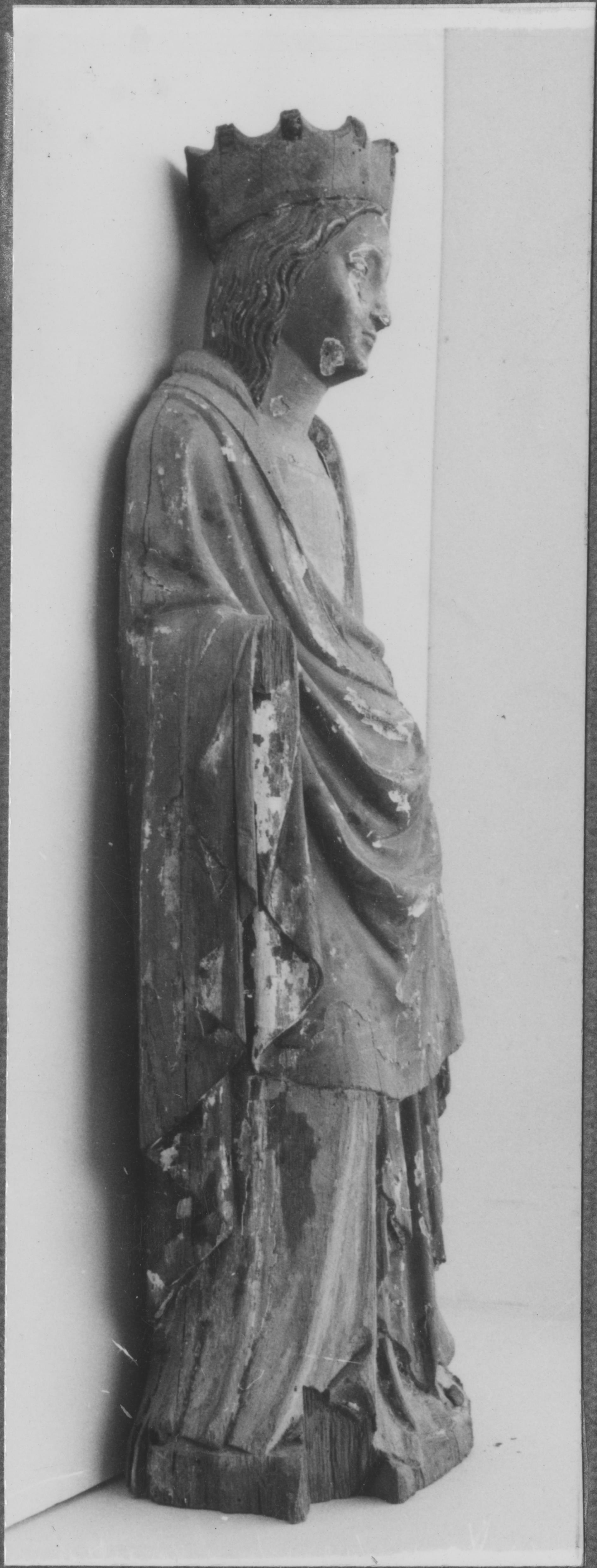 Beskrivning: Träskulptur föreställande kvinnligt helgon. 1400-talets mitt. Före restaurering 1942.
