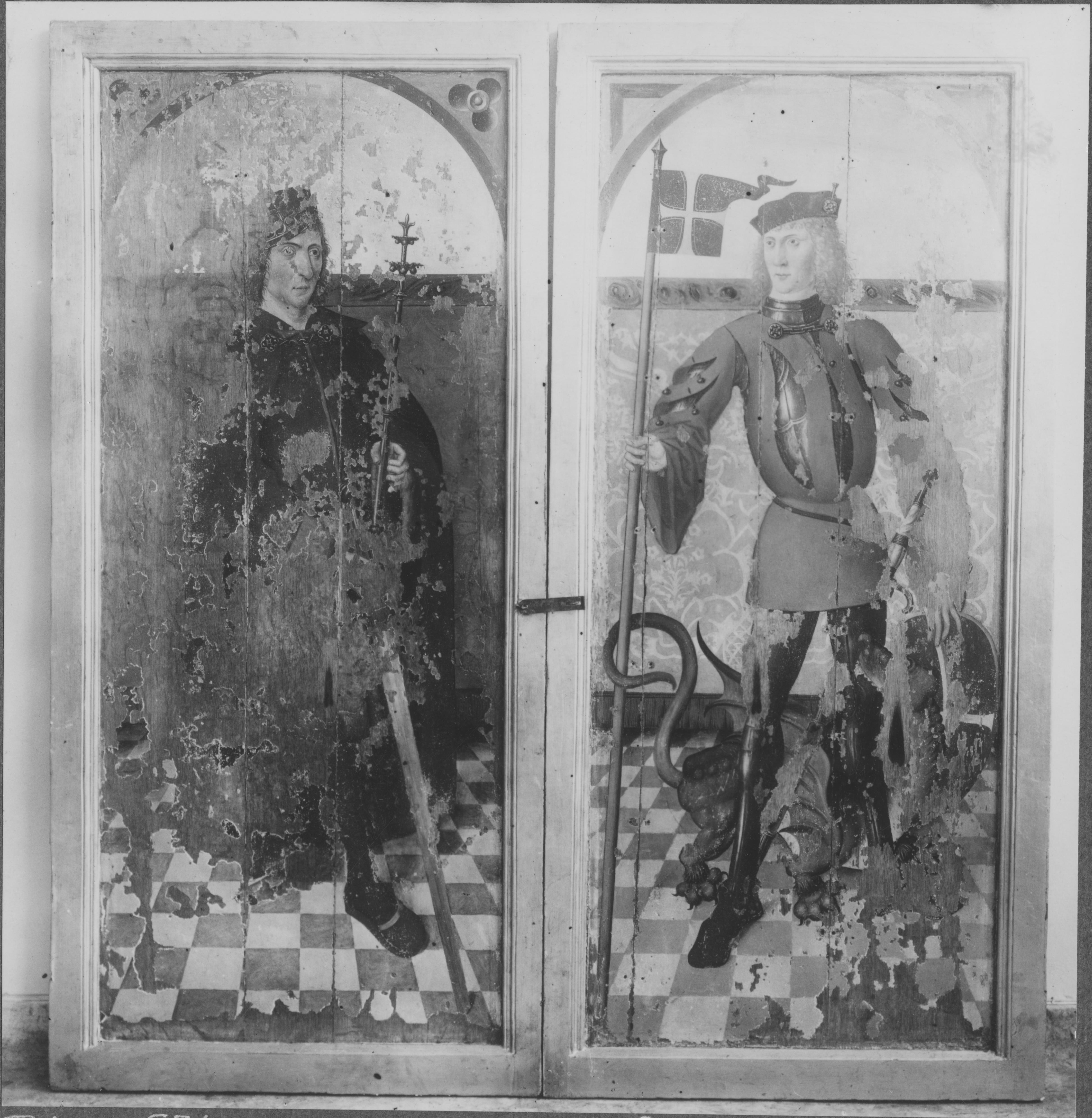 Beskrivning: Altarskåpsflyglarna, yttre. Efter konservering 1939.