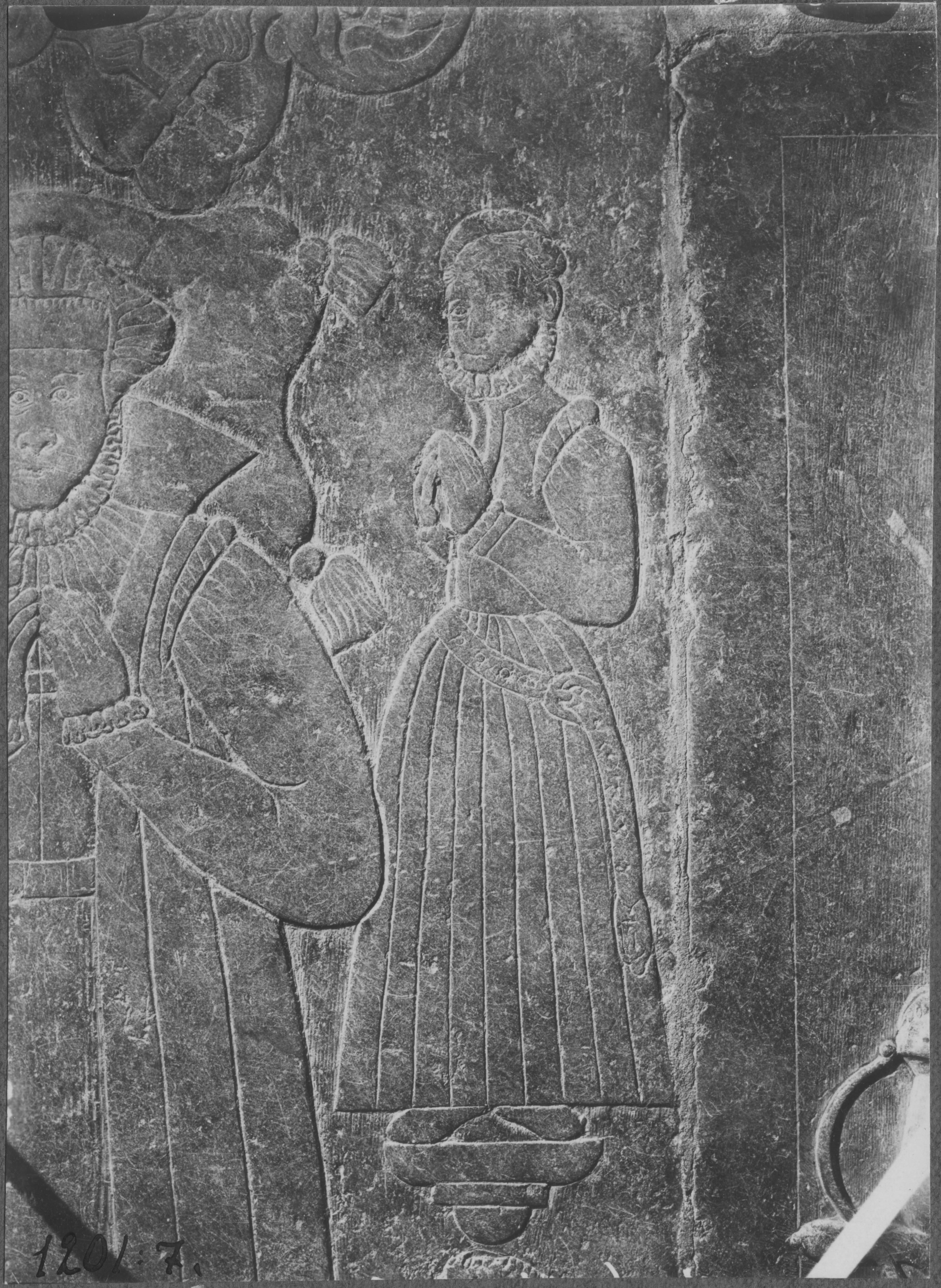 Beskrivning: Gravsten för Karl Holgersson Gera, död 1566 och Kristina Bengtsdotter Färla, död 1560. Detalj.