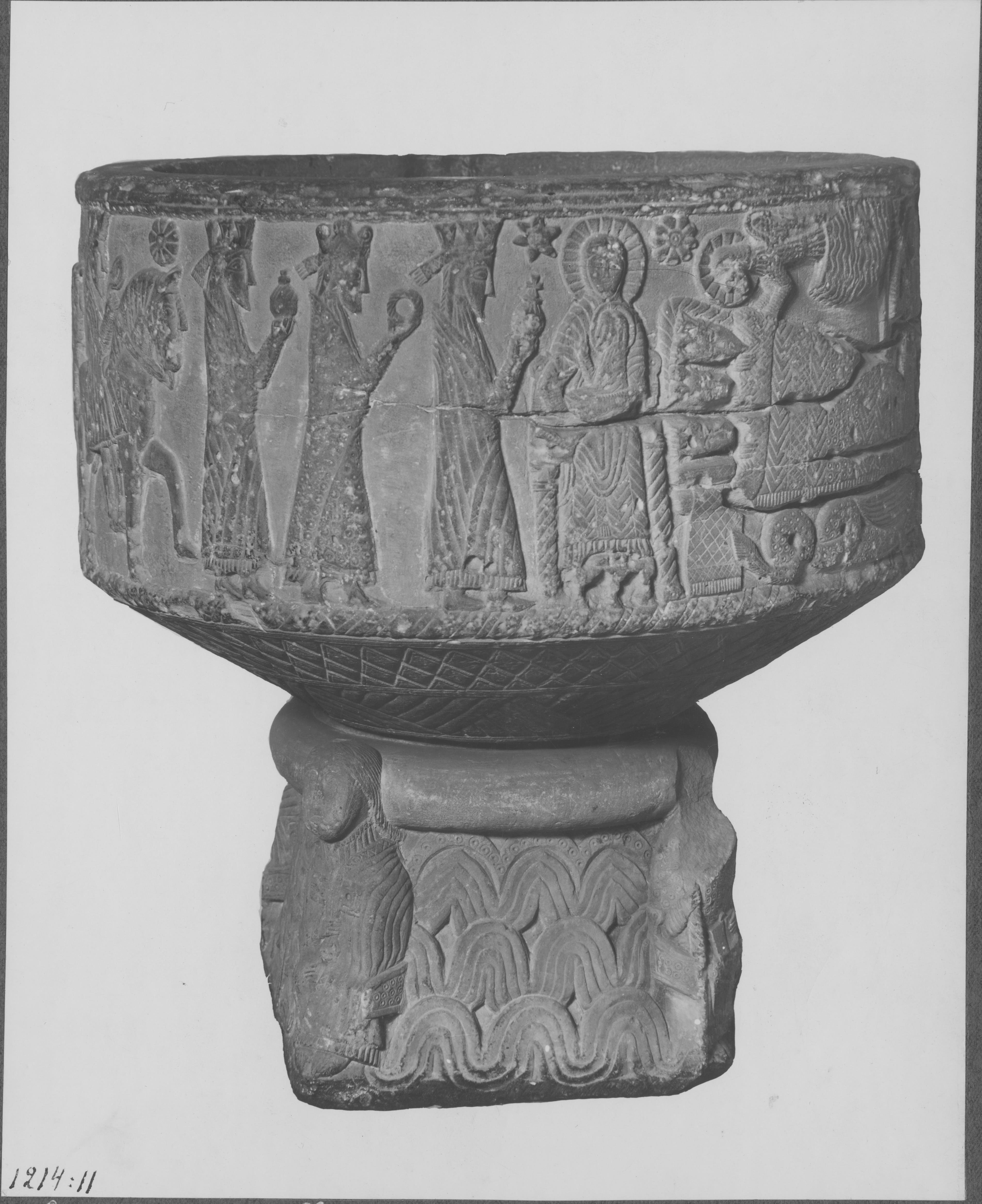 Något vittrad, horisontell sprickbildning genom cuppan. Ett fåtal färgspår av oviss ålder. Tidig medeltid.