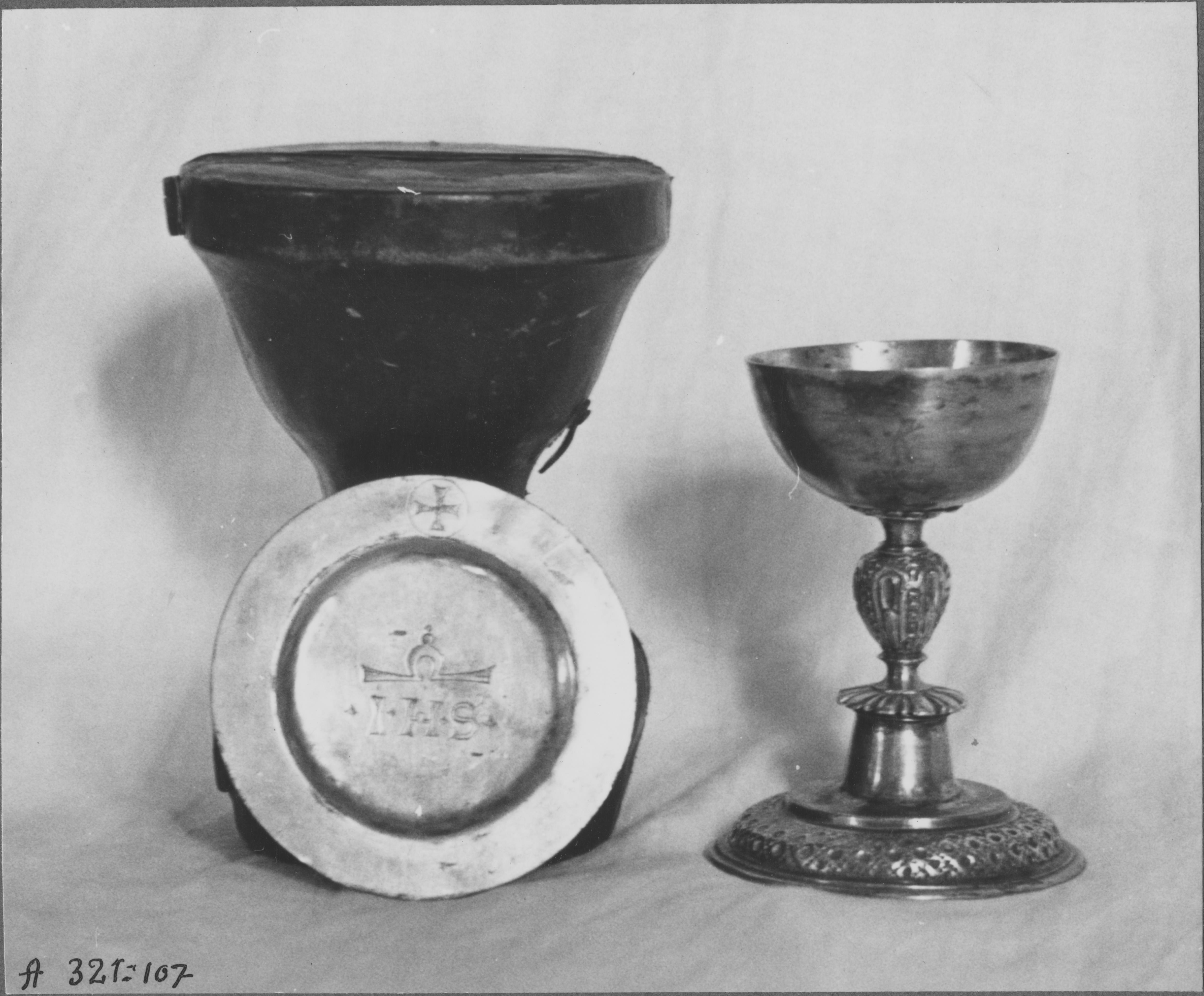 Beskrivning: Sockenbudskalk med patén och fodral.