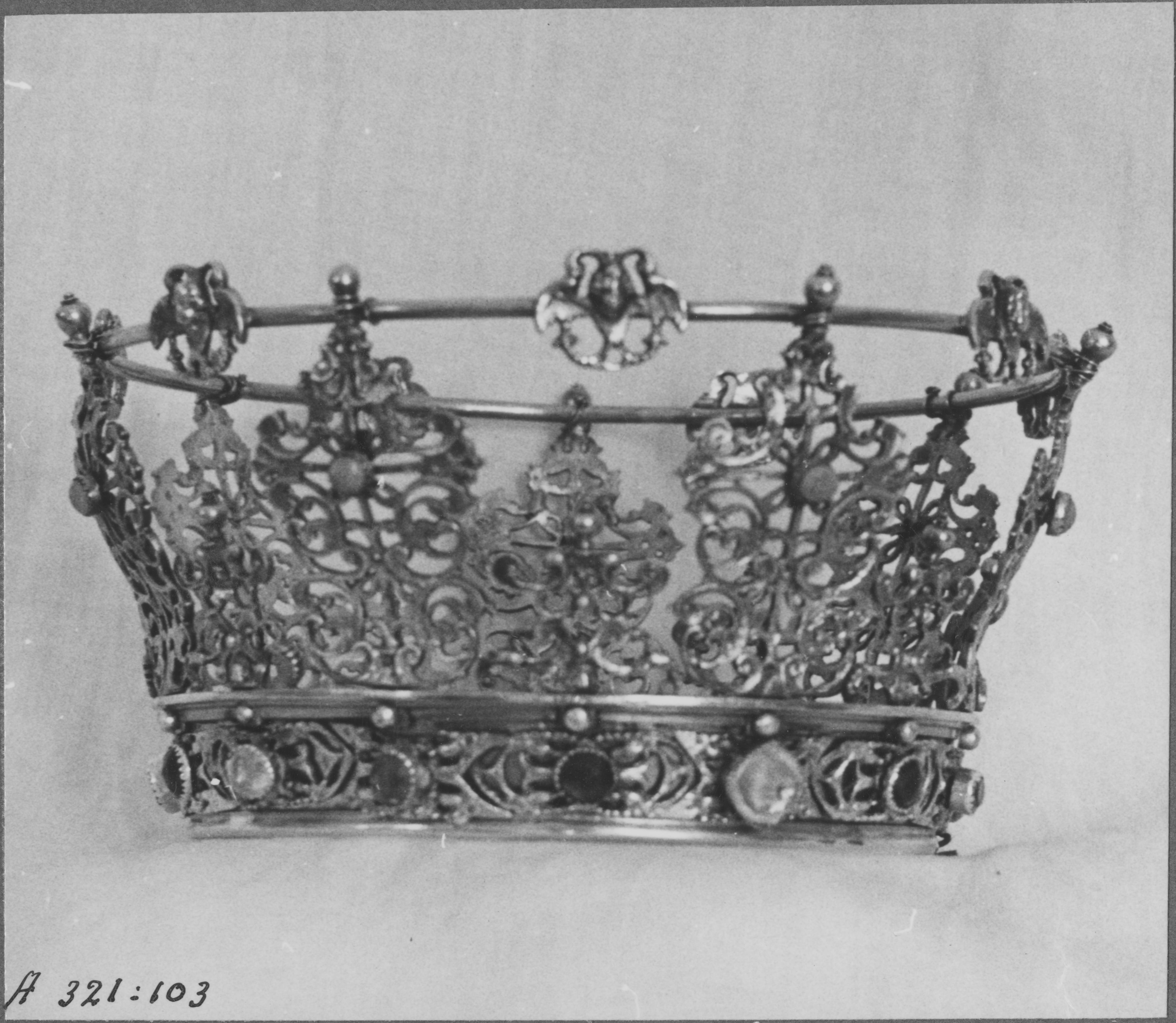 Beskrivning: Brudkrona av silver, helförgylld, med sju spetsar i genombrutet arbete med en ring.