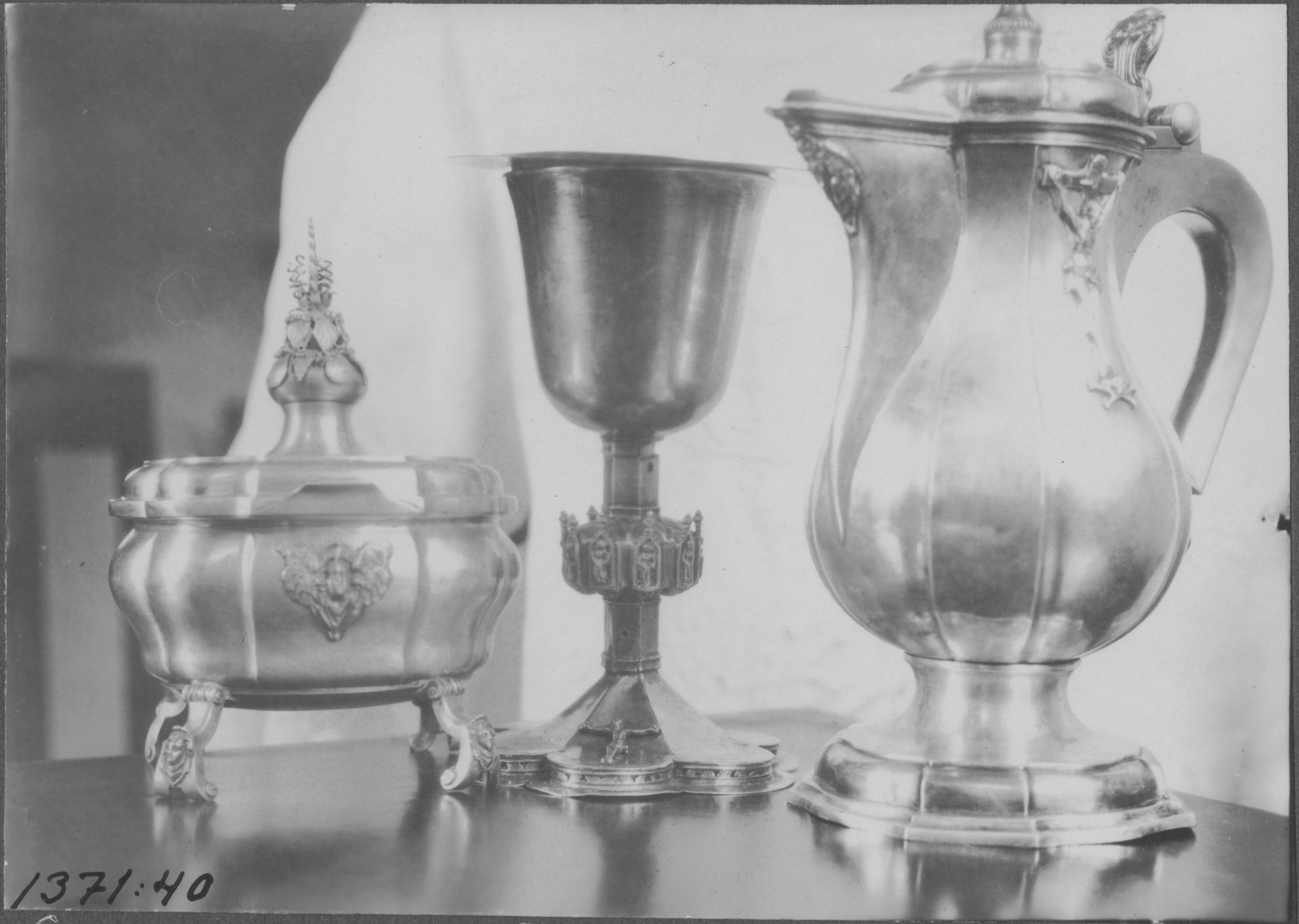 Beskrivning: Oblatask av silver, oval. Fötter med människoansikten i relief. Inköpt 1748. Kalk av silver med krucifix i relief på foten. Nod med arkadbågar med stående figur i relief. Inköpt 1746. Kanna av silver, päronformad. På kanten Kristus på korset i relief. Enligt inskrift omarbetad 1746. Snabbinventeirng.