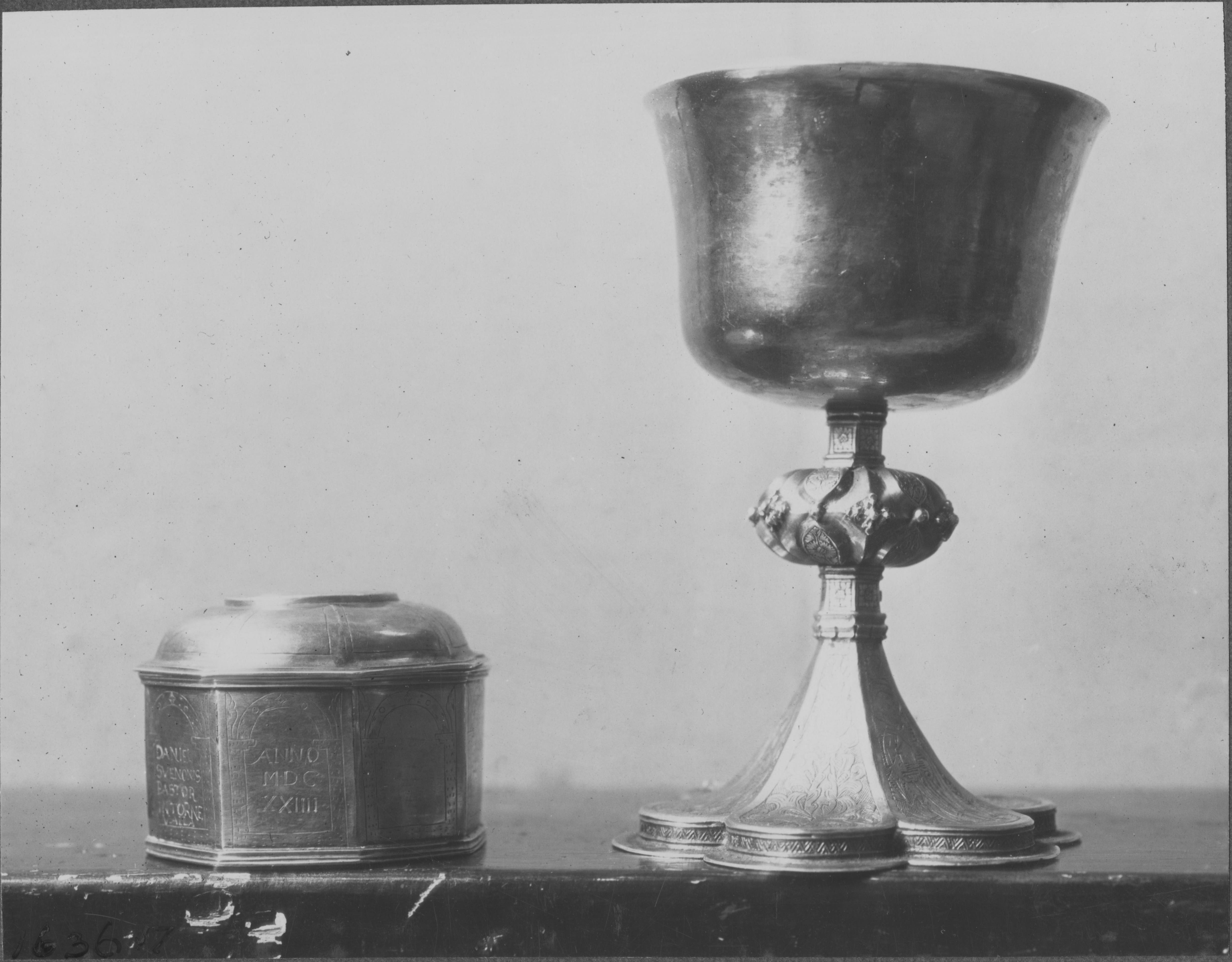 Beskrivning: Oblatask av silver, utanpå förgylld. Åttkantig med kupolformat lock. Anno 1624 enligt graverad inskrift. kalk av silver, helt förgylld. Sexpassformad for med graveringar: Jungfru Maria, Birgitta och Petrus. 1400-talets slut. Snabbinventering.