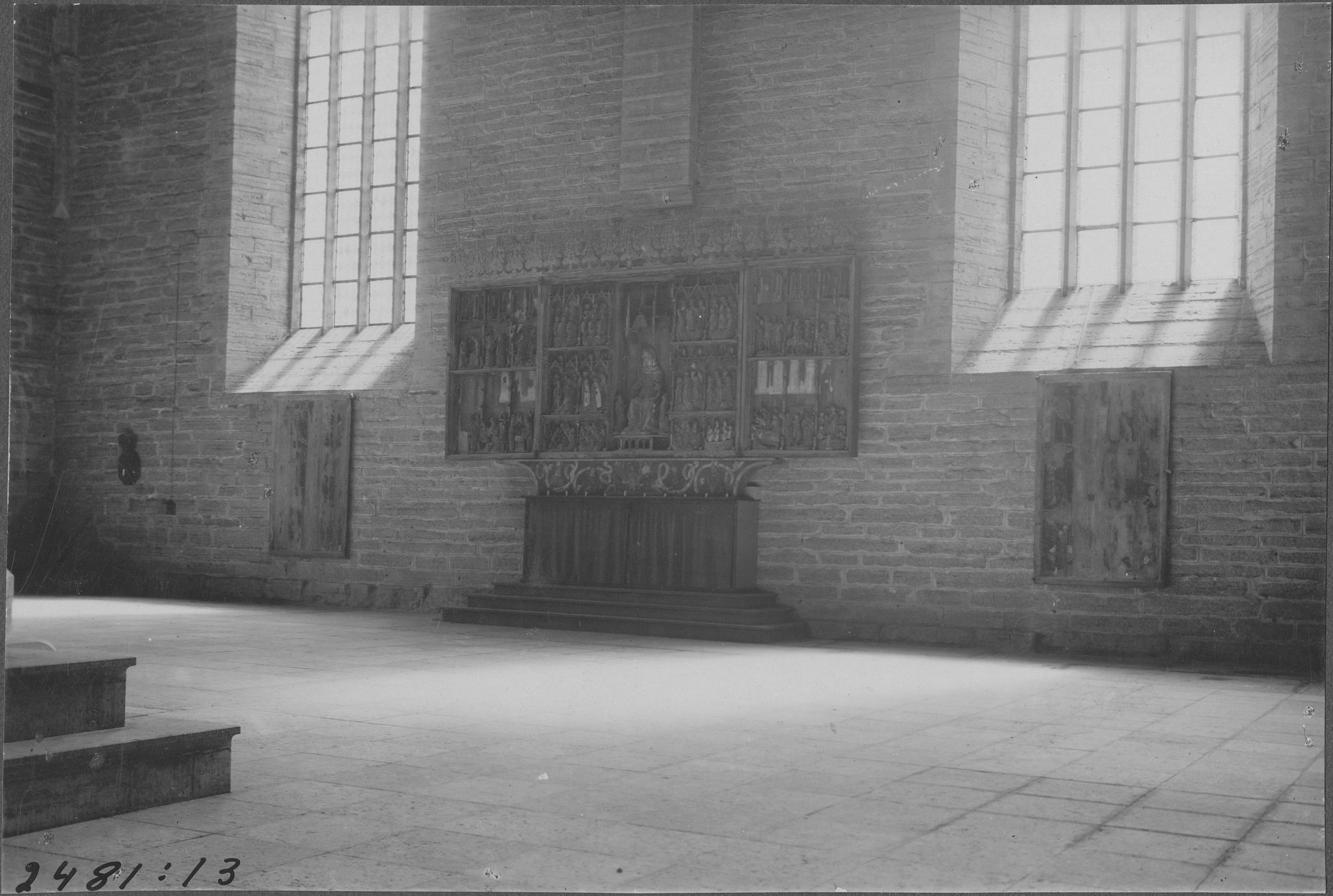 Beskrivning: Södra väggen med Birgitta-altarskåpet, uppsatt 1459 i Vadstena.