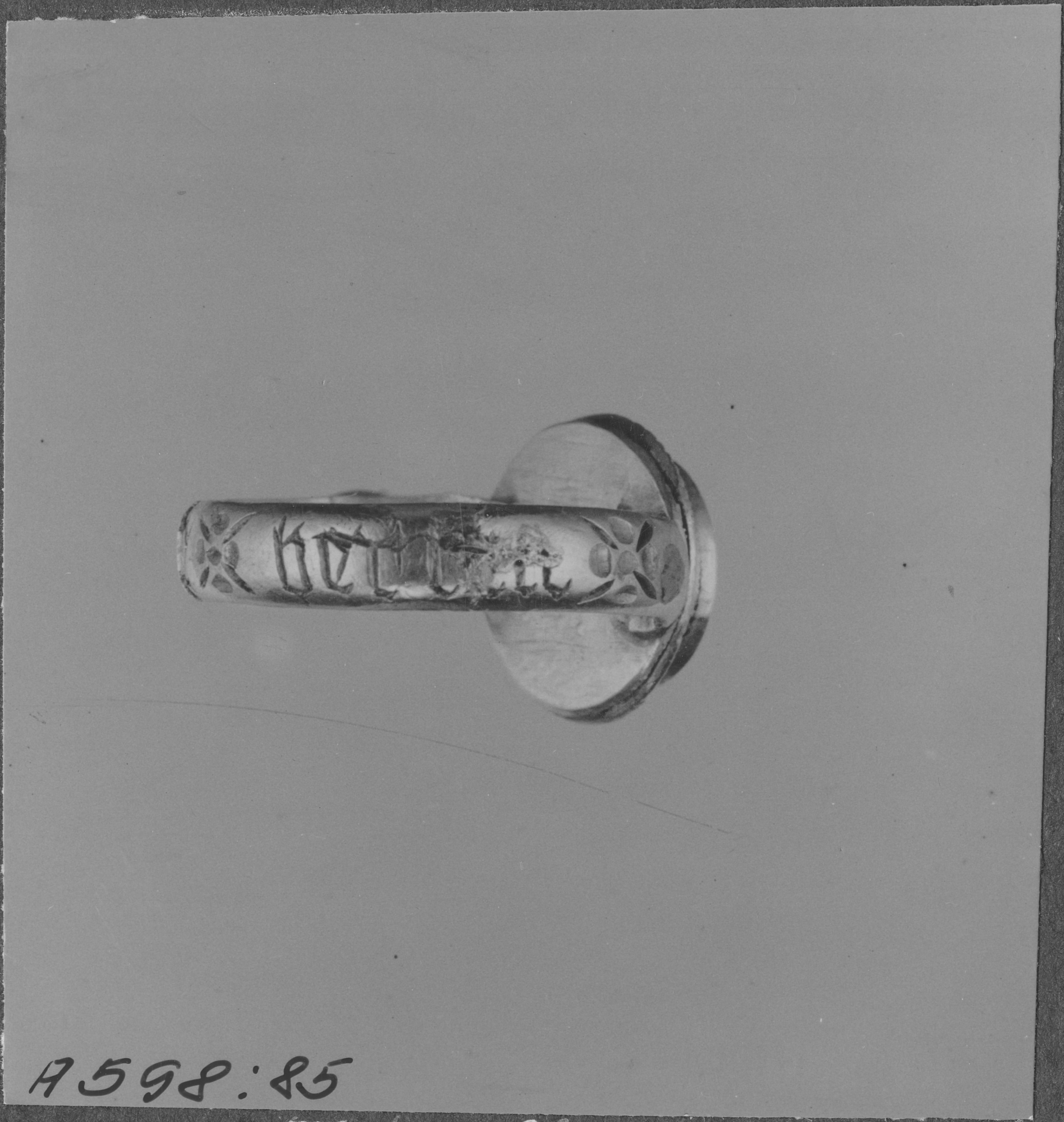 Beskrivning: Fingerring av förgyllt silver med krucifix. Funnen på 1890-talet under golvet i kyrkan.