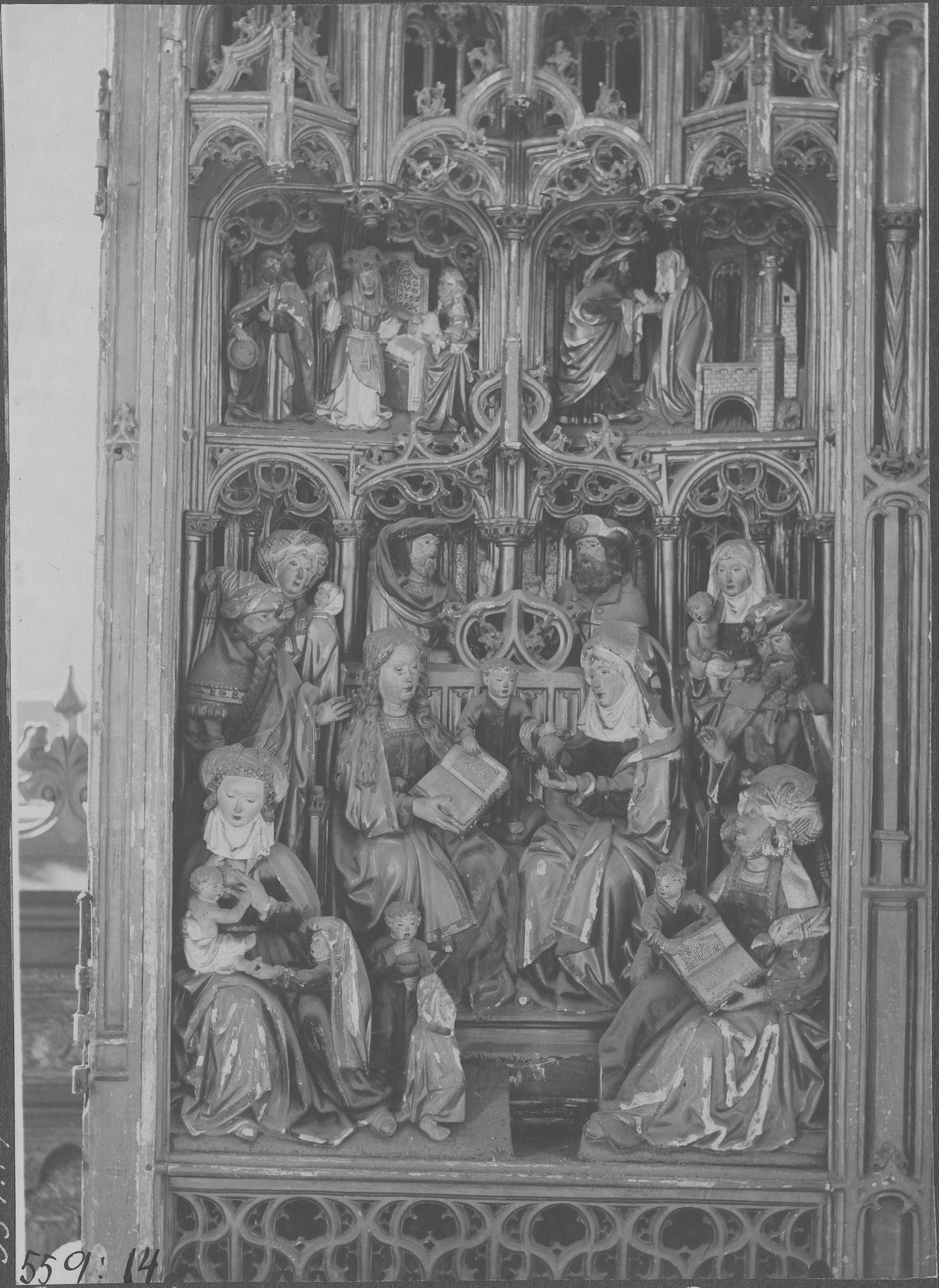 Från 1500-talets första fjärdedel. Detalj, Heliga släkten Maria och Anna. Före konservering.
