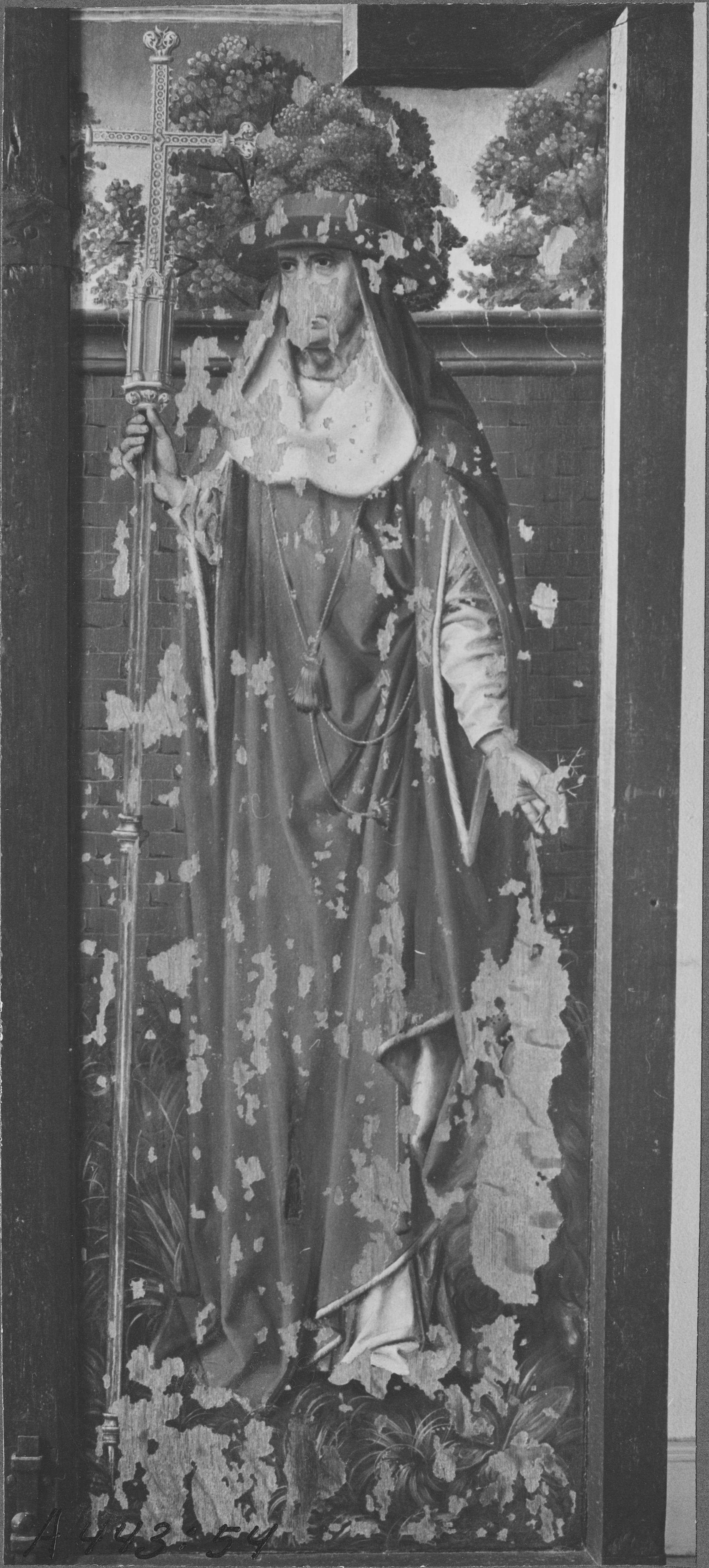 Beskrivning: Altarskåp av ek. Tillverkad i Brysselverkstad. Från 1500-talets första fjärdedel. Skåpets utsida, detalj.