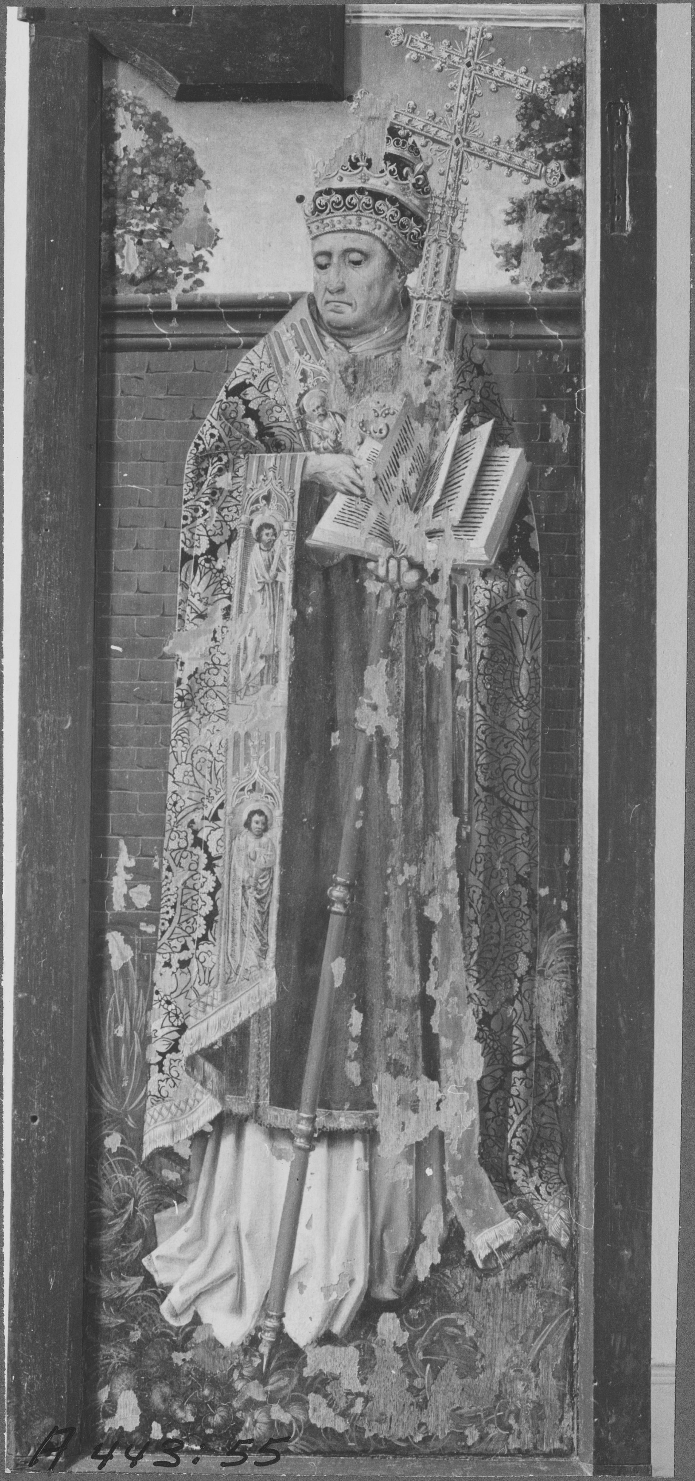 Beskrivning: Altarskåp av ek. Tillverkad i Brysselverkstad. Från 1500-talets första fjärdedel. Skåpets utsida, detalj.