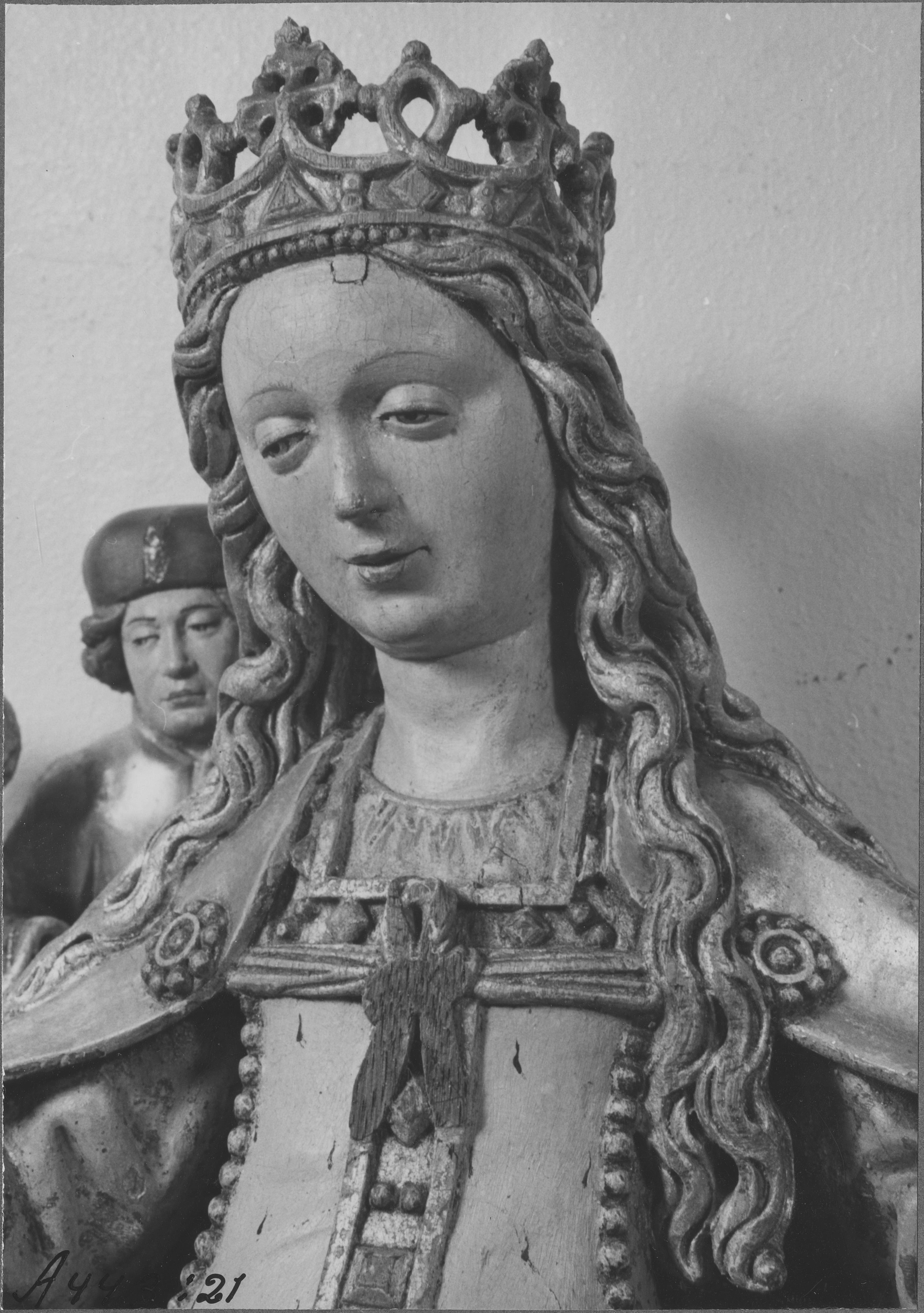 Beskrivning: Altarskåp av ek. Tillverkad i Brysselverkstad. Från 1500-talets första fjärdedel. Detalj, träfigurer, ur gruppen Ursula och de 11000 jungfurna.