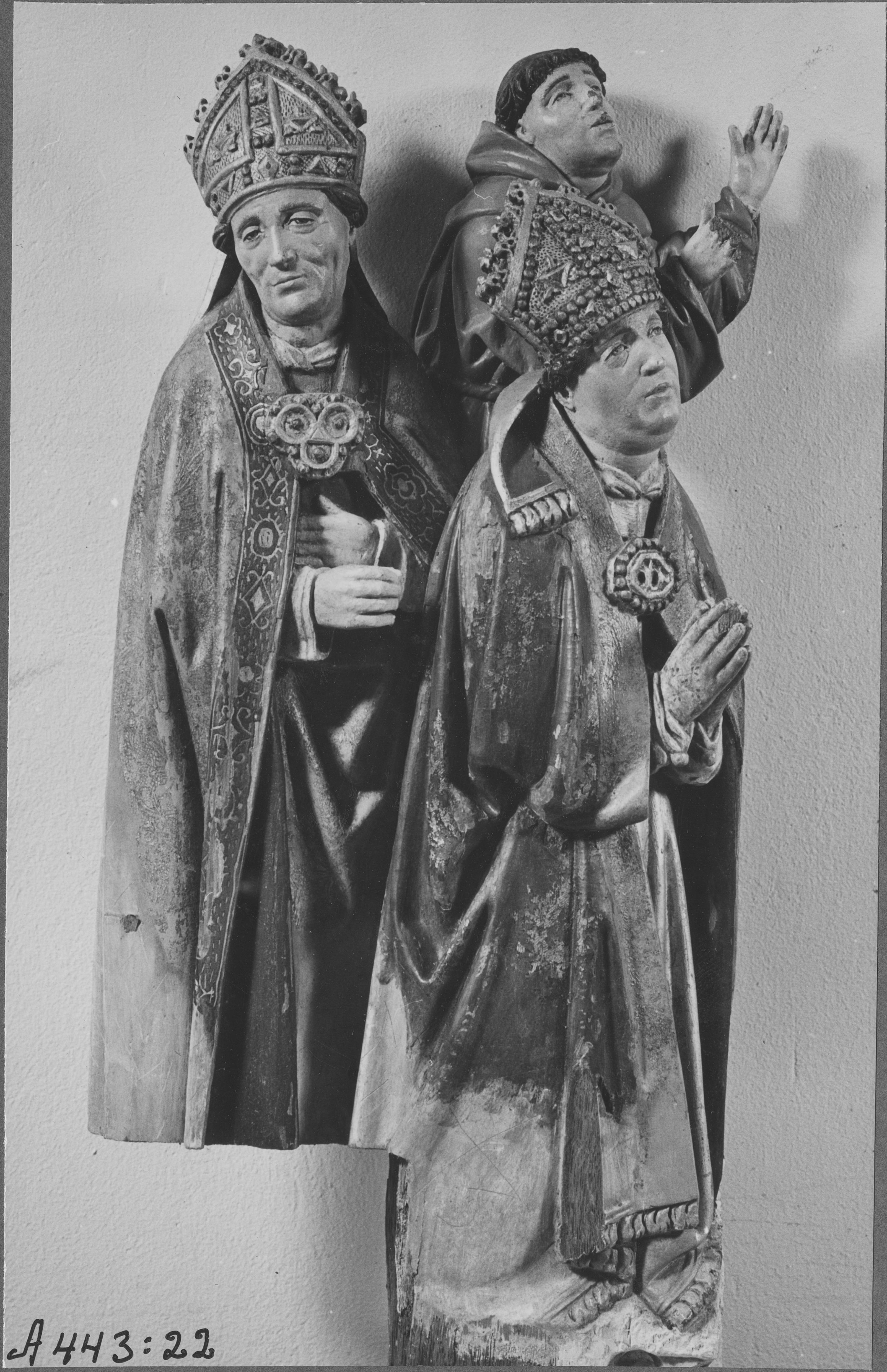 Beskrivning: Altarskåp av ek. Tillverkad i Brysselverkstad. Från 1500-talets första fjärdedel. Detalj, träfigurer, ur gruppen Marias förhärligande.