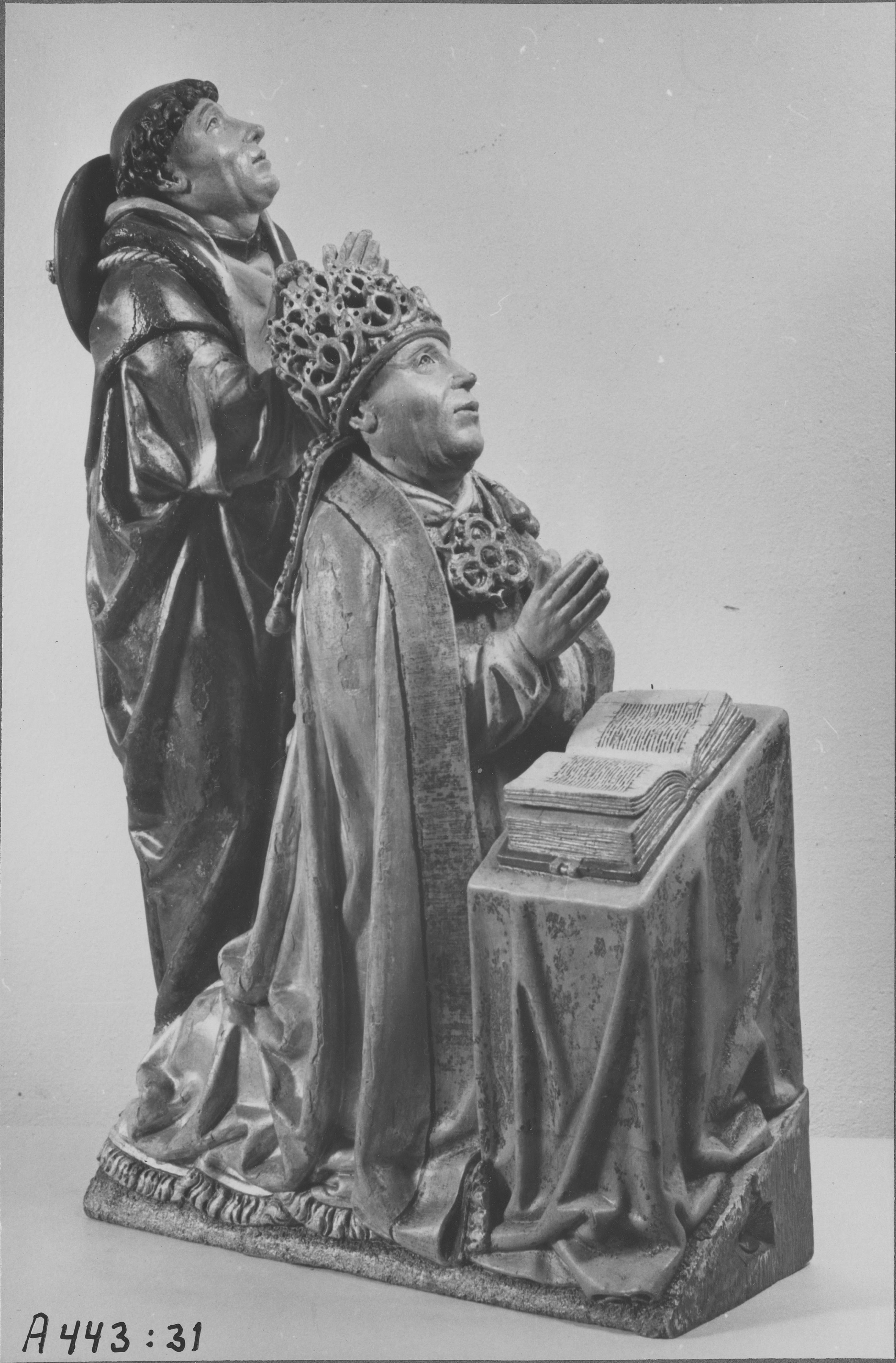 Beskrivning: Altarskåp av ek. Tillverkad i Brysselverkstad. Från 1500-talets första fjärdedel. Detalj, träfigurer, ur gruppen Marias förhärligande.