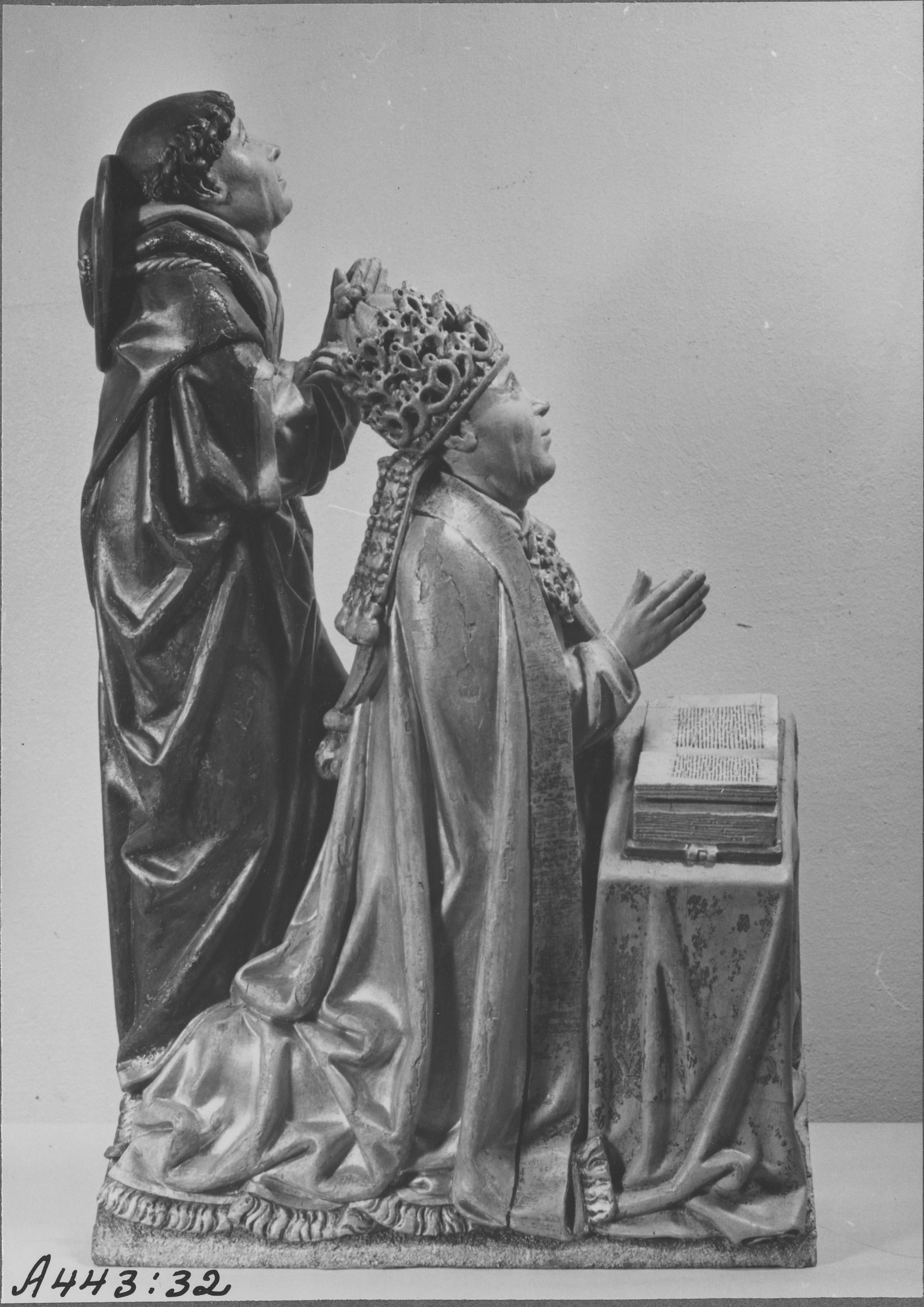 Beskrivning: Altarskåp av ek. Tillverkad i Brysselverkstad. Från 1500-talets första fjärdedel. Detalj, träfigurer, ur gruppen Marias förhärligande.