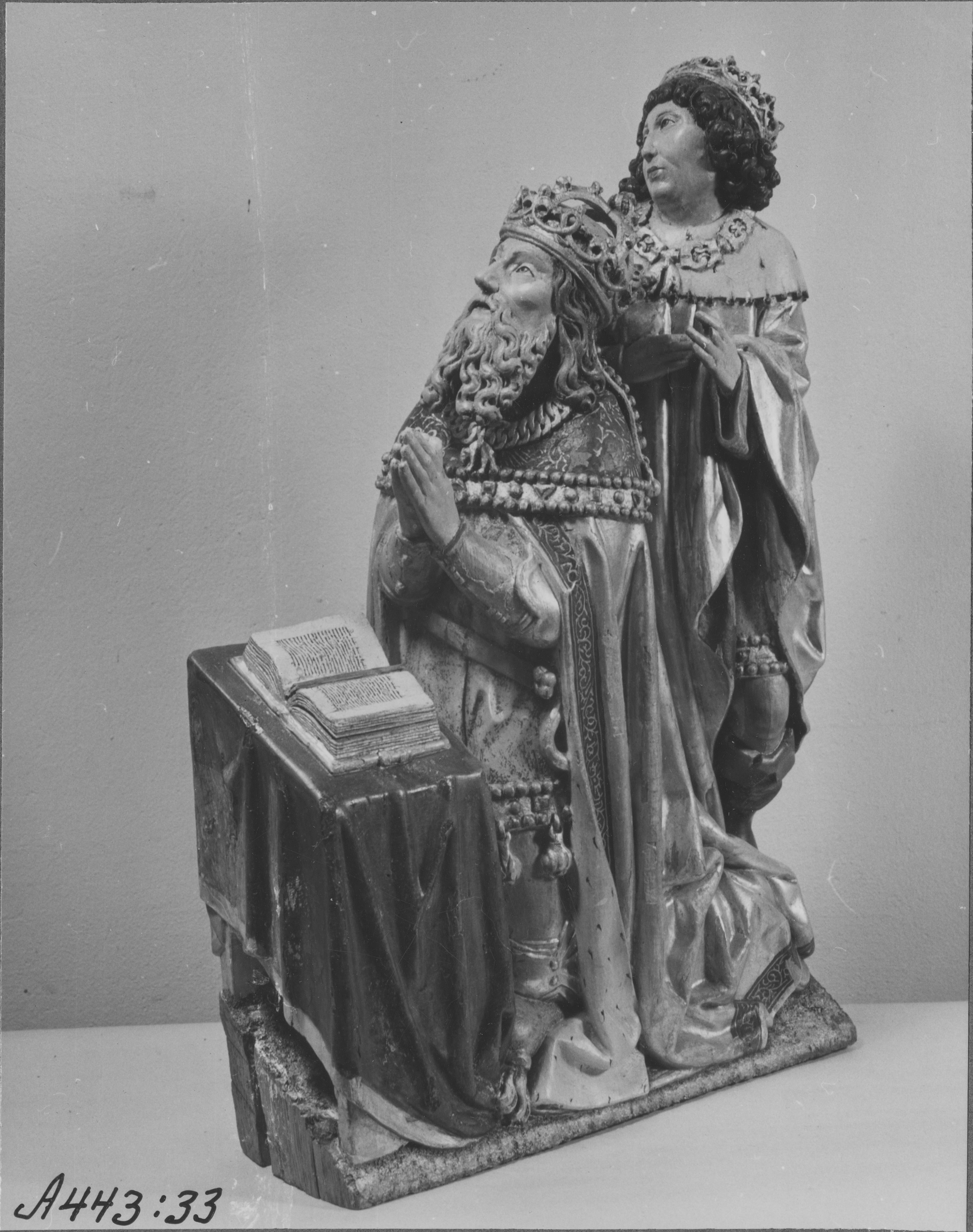 Beskrivning: Altarskåp av ek. Tillverkad i Brysselverkstad. Från 1500-talets första fjärdedel. Detalj, träfigurer, ur gruppen Marias förhärligande.