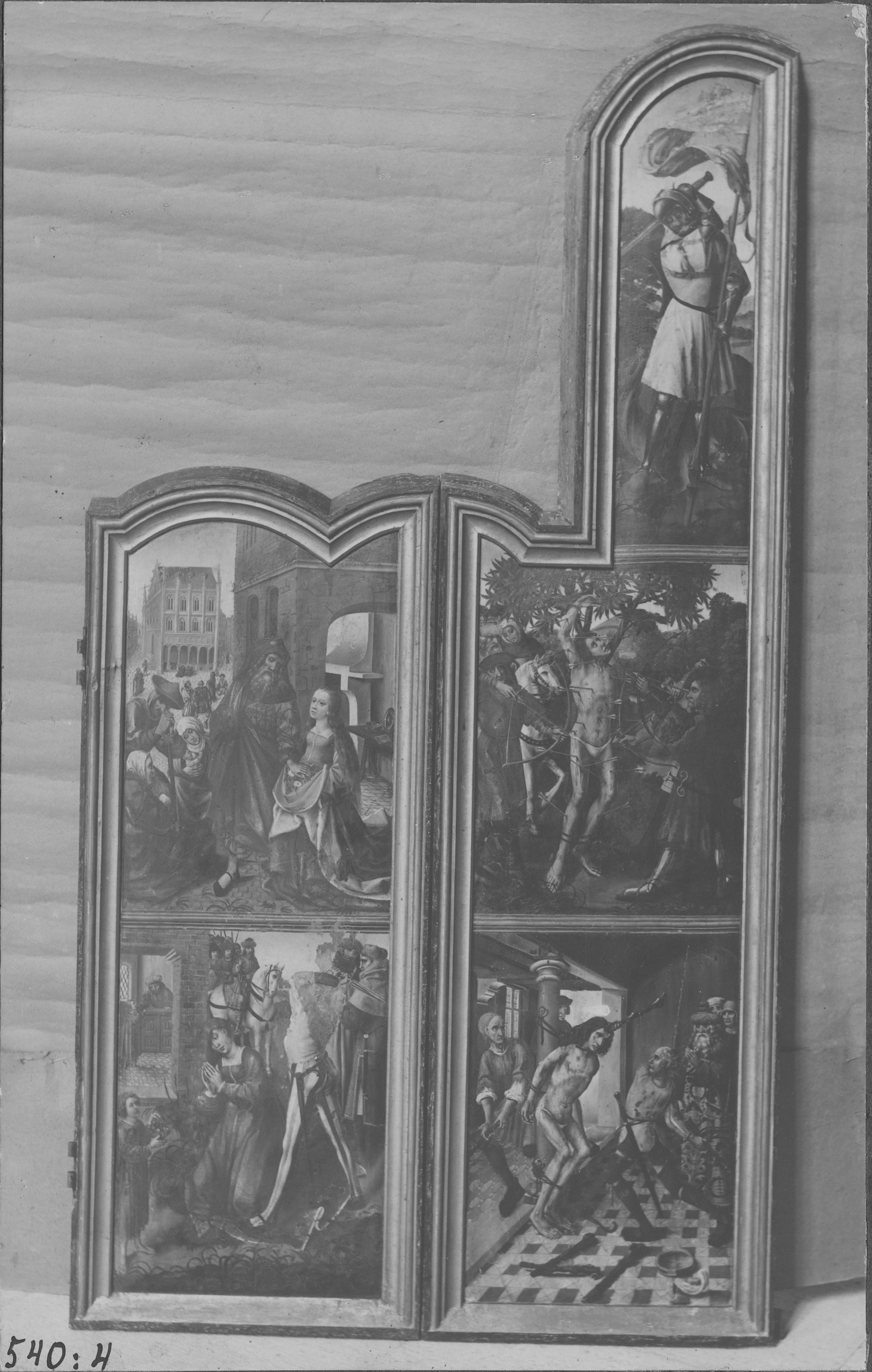 Beskrivning: Altarskåp av ek. Tillverkad i Brysselverkstad. Från 1500-talets första fjärdedel. Flygel efter konservering.