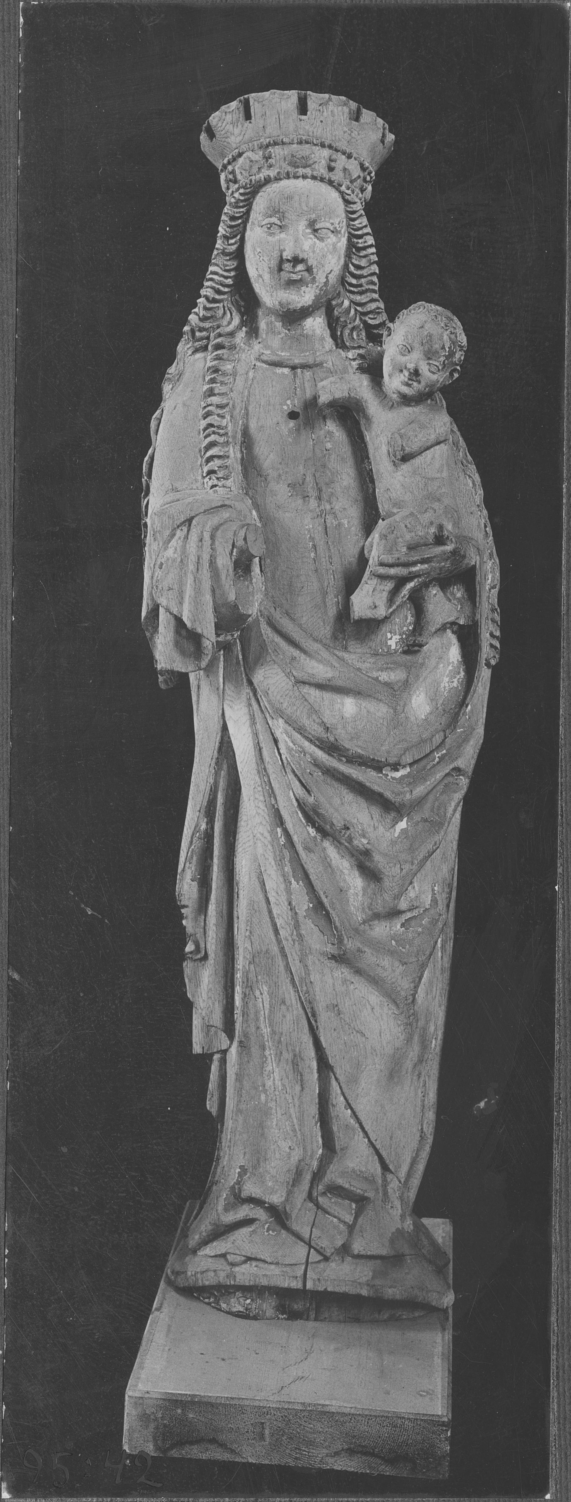 Beskrivning: Träskulptur föreställande Madonna med barnet.
