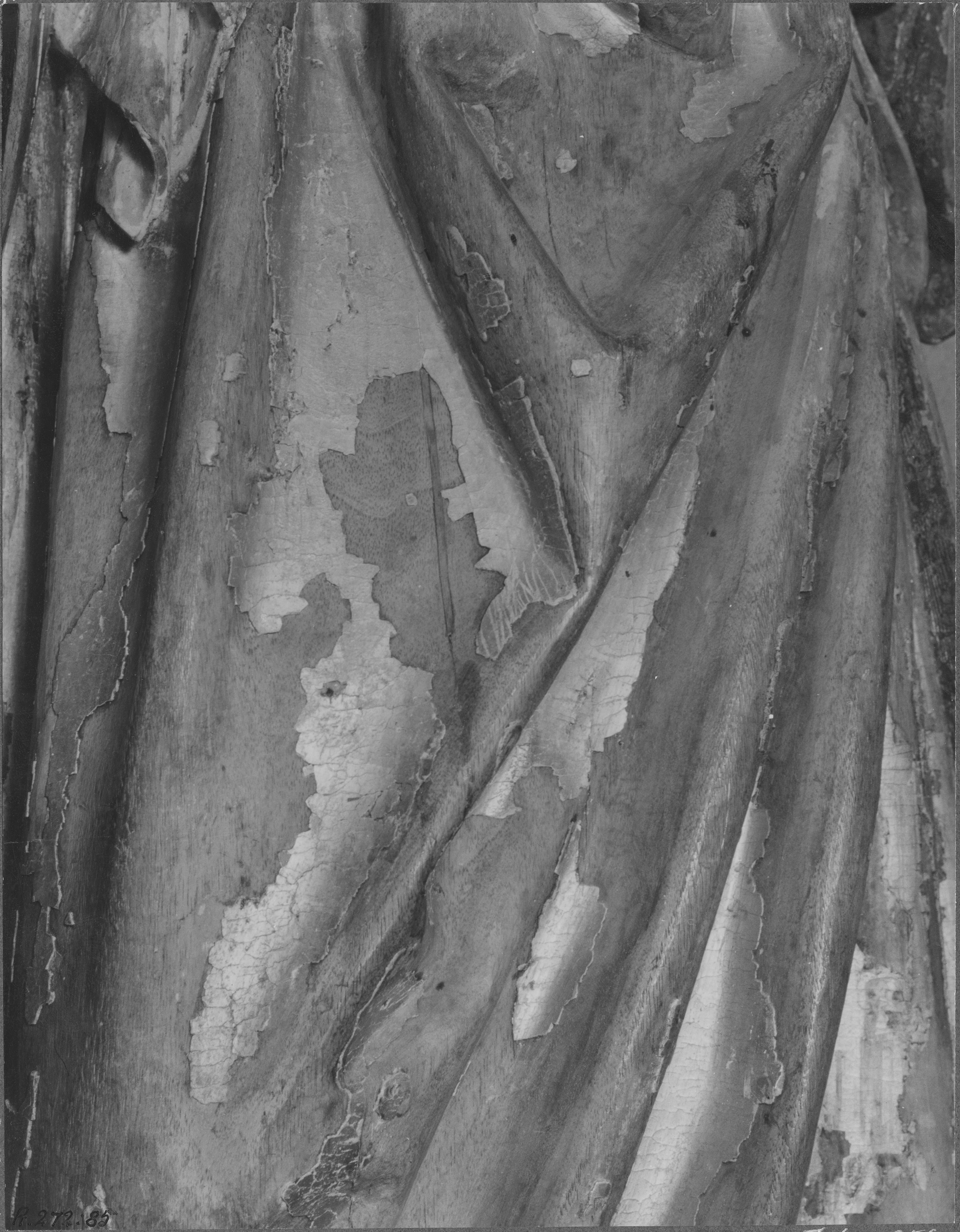 Beskrivning: Träskulptur i lövträ föreställande Madonnan med barnet. Detalj. Omkring 1500.